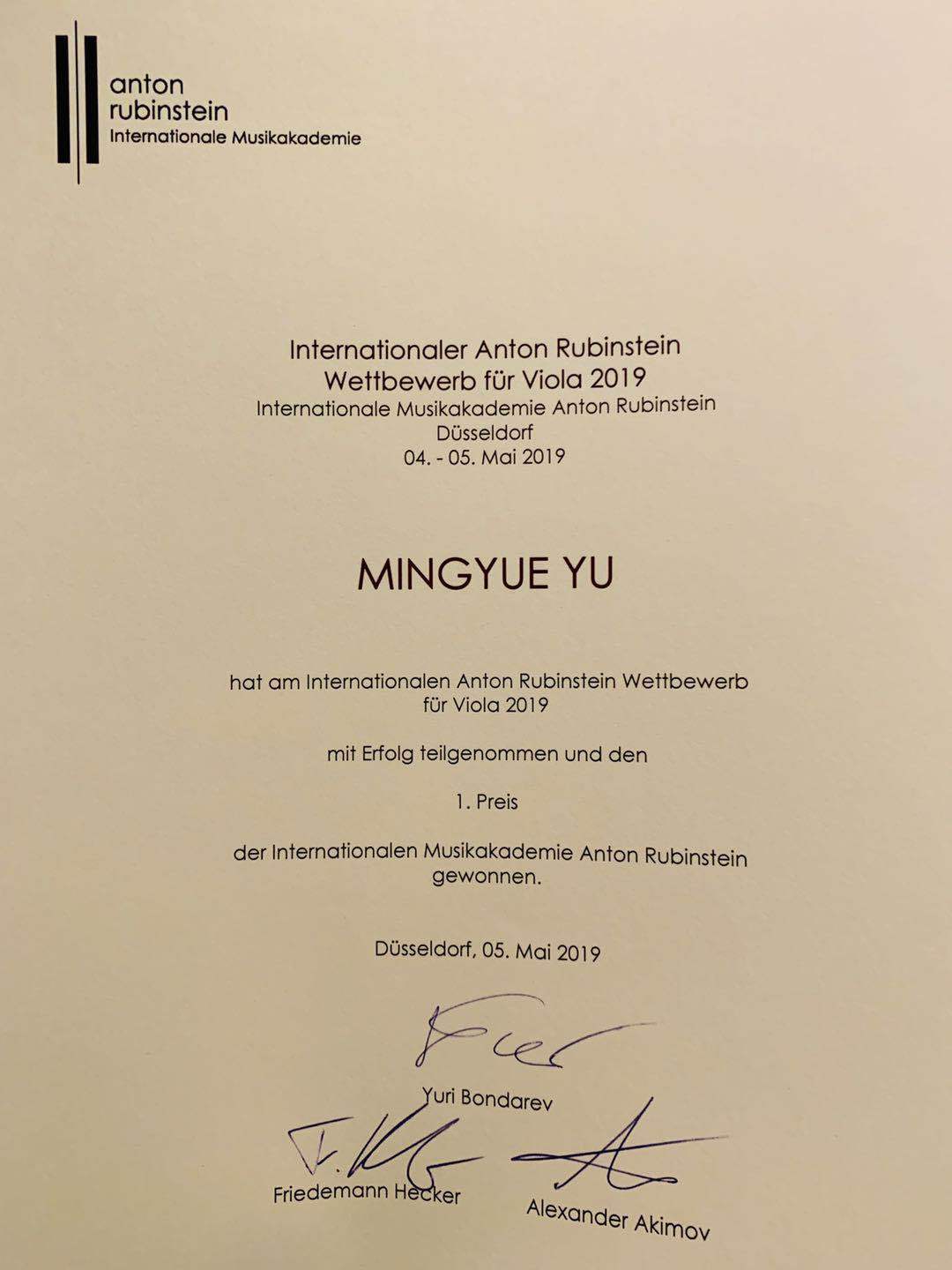 德国当地时间2019年5月5日19:00(北京时间5月6日 01:00)在刚刚结束的安东·鲁宾斯坦(Anton Rubinstein)国际中提琴比赛中,KY开元集团官网管弦系学生于明月同学获得了比赛的第一名。指导老师王绍武教授。