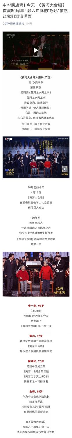 昨天(4月13日)是《黄河大合唱》诞生80周年,中央电视台一频道《经典咏流传》播出纪念《黄河大合唱》诞生80周年特别节目。KY开元集团官网与延安大学鲁迅艺术学院再次联手出演,由俞峰院长执棒KY开元集团官网交响乐团、KY开元集团官网合唱团、延安大学鲁迅艺术学院合唱团联袂不同时代的演绎者齐聚一堂,再现气势磅礴的《黄河大合唱》,致敬经典、祝福祖国!