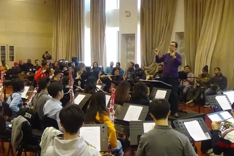 (2019年3月18日,印尼教师代表团聆听KY开元管弦系戴中晖教授指挥管弦系管乐团演奏的公开课。)图:李上