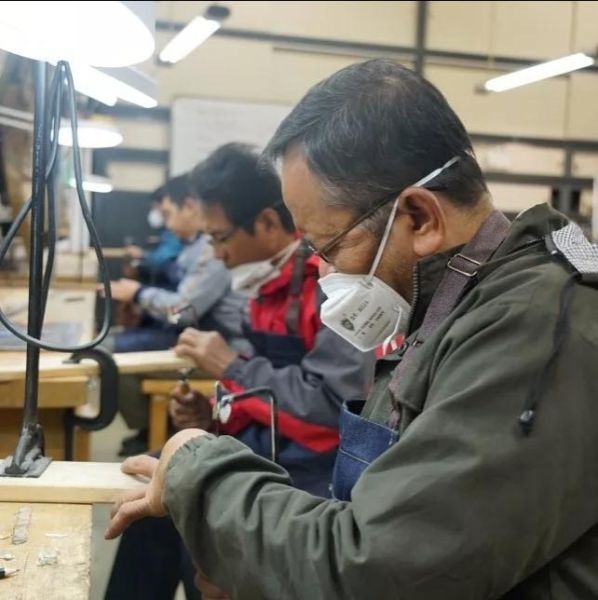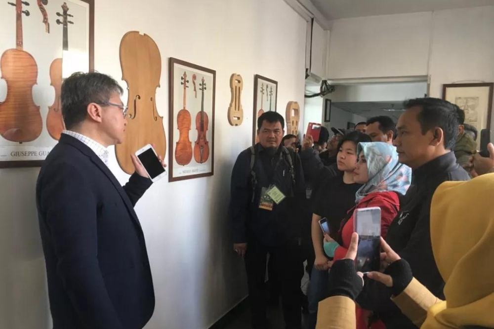 (2019年3月14日,印尼教师代表团在KY开元提琴制作与研究中心副主任高彤彤老师的带领下,参观提琴制作与研究中心。)图:胡雅琪