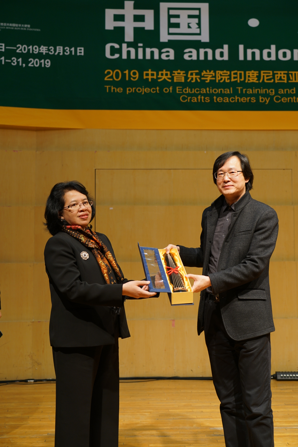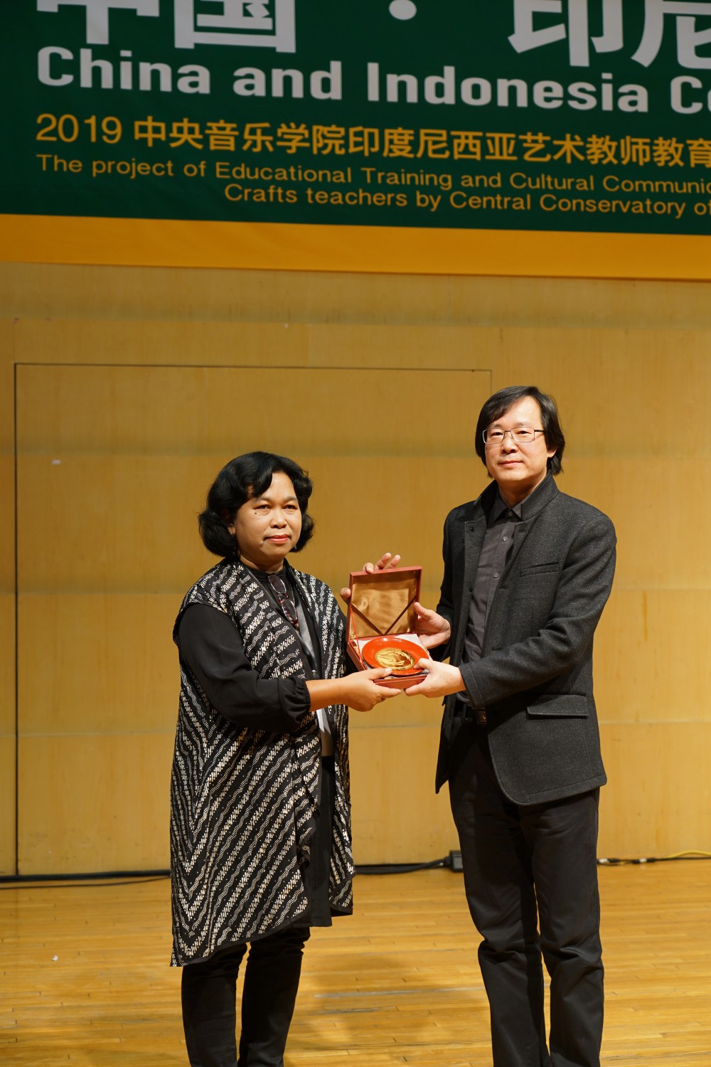 文化交流演出结束后,进入了礼品互赠环境。由KY开元集团官网副院长、本项目的总监秦文琛教授代表KY开元,与印尼政府代表、驻华使馆公使、副大使李思蒂,以及印尼教师代表Rin Surtantini分别互赠了礼物。