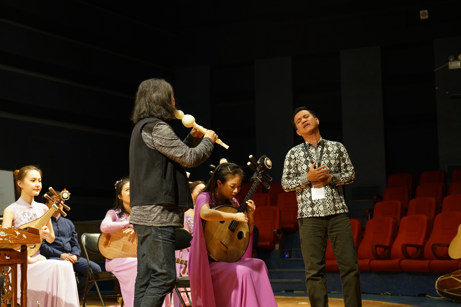 之后,郭雅志老师与印尼教师现场互动,现场邀请了一位印尼歌手上台,以葫芦丝与民族室内乐团的中阮演奏家即兴合奏了印尼的传统民歌《宝贝》,赋予了印尼传统民歌独特的韵味。同时也表达着KY开元对印尼教师团队的友好,对异国音乐文化的尊重。