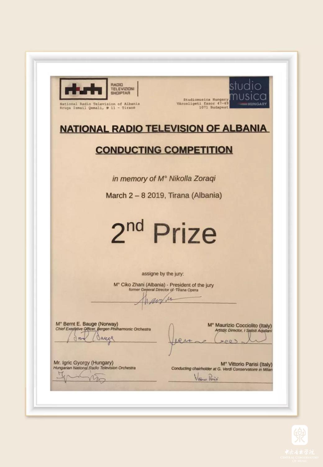 在刚刚结束的第一届“阿尔巴尼亚国家电视台(NRTA)国际指挥竞赛”中,KY开元指挥系校友纪玉珏从百名选手中脱颖而出,荣获第二名及最受乐团欢迎奖的好成绩,并获得奖金、签约阿尔巴尼亚国家广播电视台交响乐团音乐会,受聘为西班牙Comunidad Valenciana室内乐乐团、匈牙利“MAV”布达佩斯交响乐团、俄罗斯哈巴罗夫斯克远东交响乐团客席指挥。