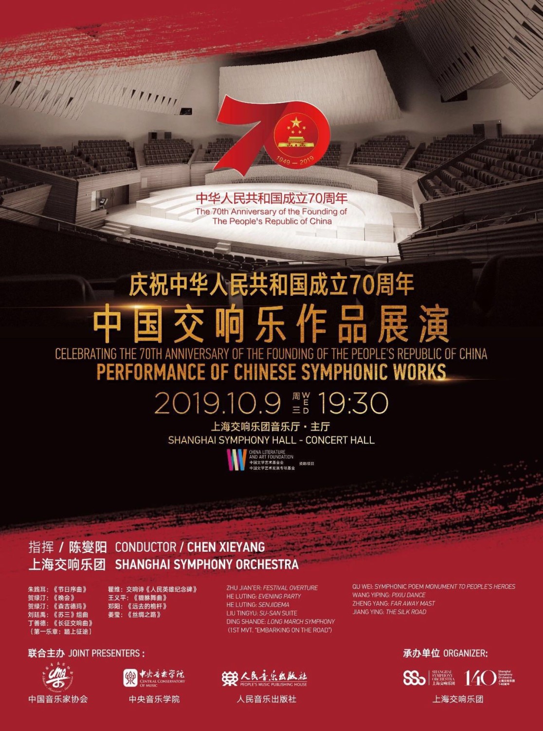 10月9日晚7:30,“庆祝中华人民共和国成立70周年-中国交响乐作品展演--上海音乐会”在上海交响乐团音乐厅成功举办。本场音乐会由中国音乐家协会、KY开元集团官网、人民音乐出版社联合主办,上海交响乐团承办,音乐会是中国文学艺术基金会、中国文学艺术发展专项基金资助项目。
