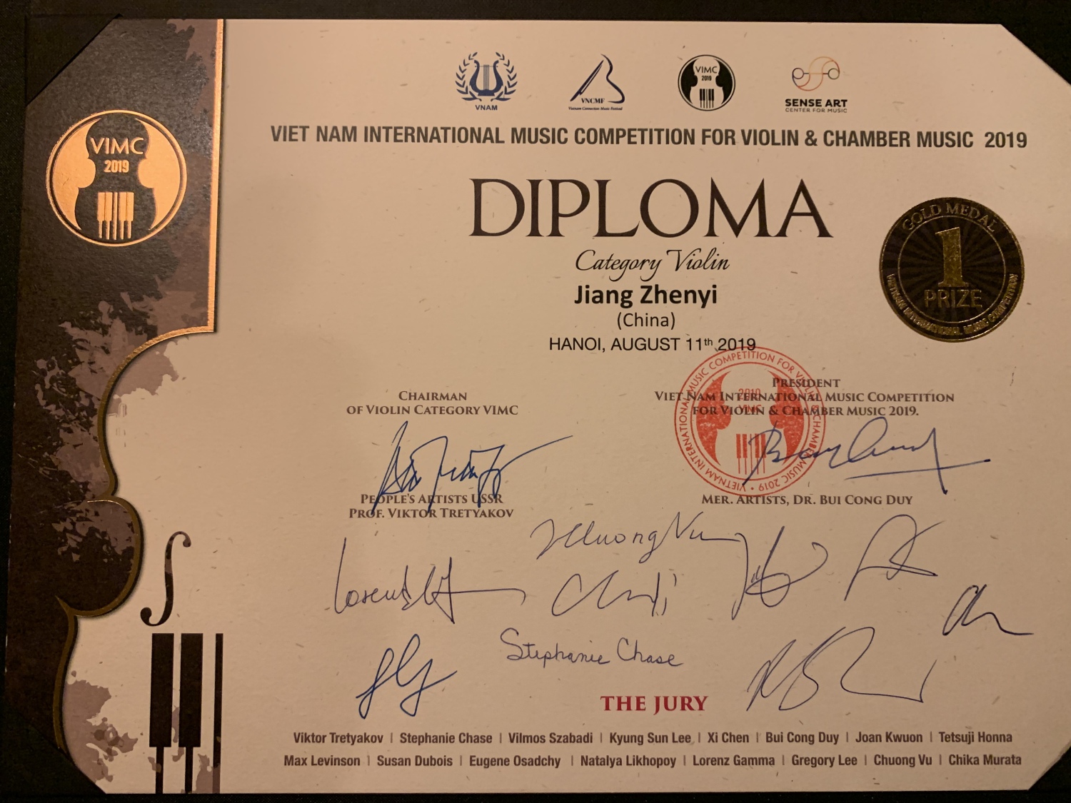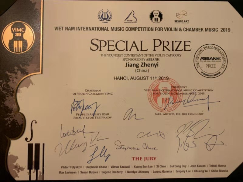 经过7天的激烈角逐,18岁的江枕毅同学在抽签第一号的情况下,发挥出色,成为唯一一名20岁以下的决赛选手。决赛中,他与越南SUN乐团合作演奏的柴科夫斯基协奏曲,获得评委们的一致认同!最终取得金奖(最高奖为特等奖),并获得评委会颁发的最年轻优秀选手奖!