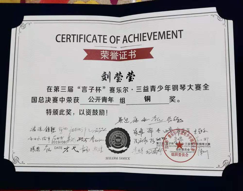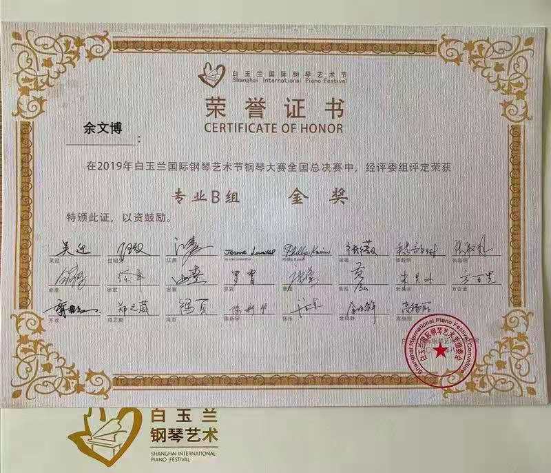 2017年在“斯坦伯格全国青少年钢琴大赛”中,获专业青年组一等奖。2019年获第三届“赛乐尔•三益青少年钢琴大赛”全国总决赛铜奖,2019白玉兰国际钢琴艺术节钢琴大赛全国总决赛专业组第三名。