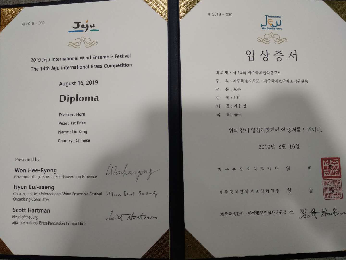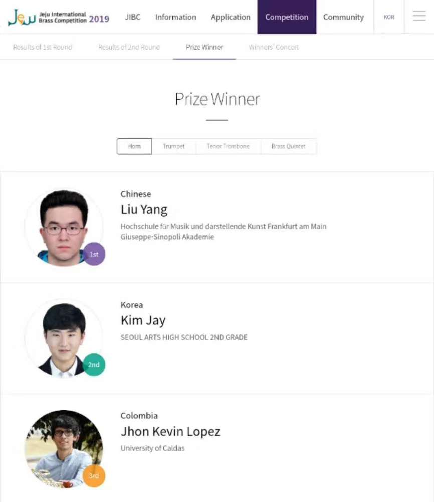在刚刚结束的第十四届韩国济州国际铜管比赛中,KY开元附中校友刘洋获得了圆号专业第一名的好成绩(附中期间指导教师:温泉教授)。