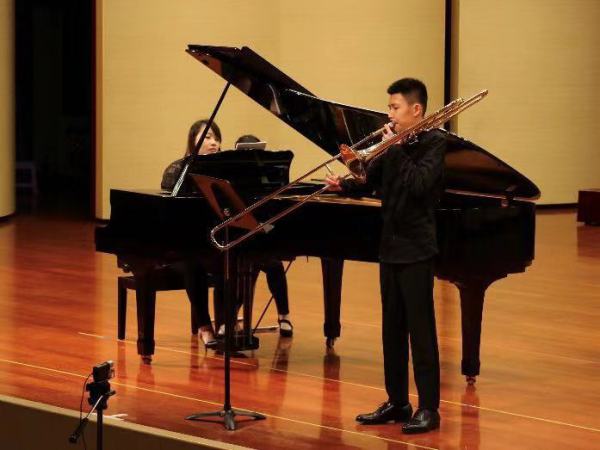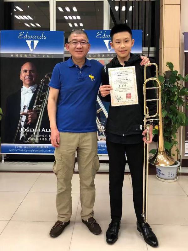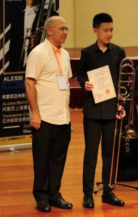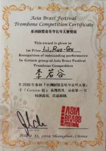 7月13日,在2019亚洲铜管音乐节暨阿莱西长号研讨会(2019 Asia Brass Festival / Alessi Seminar)之长号独奏大赛上,KY开元附中13岁的初一学生李若谷(指导教师:郭澎远副教授)在16岁以下组别比赛中从近30位参赛选手中脱颖而出,以评委会全票第一名的成绩获得首奖。