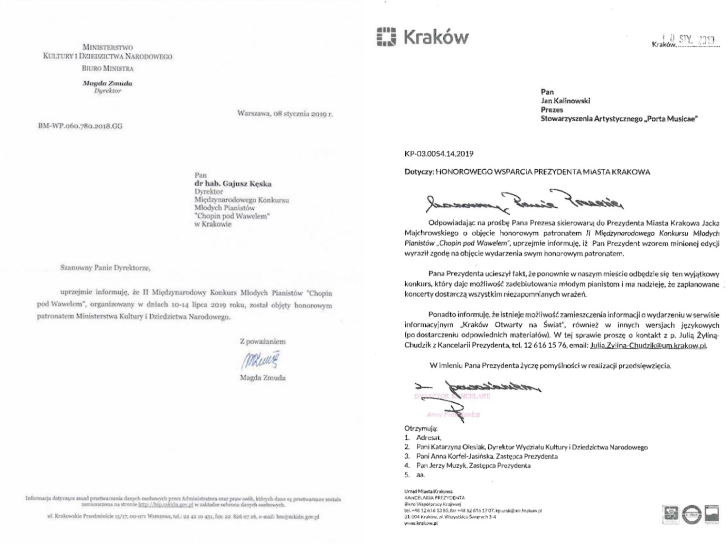 第二届“肖邦-瓦维尔”国际青少年钢琴大赛获得波兰文化和国家遗产部以及克拉科夫市市长的支持,以克拉科夫国立音乐学院古典音乐厅“Florianka”为主赛场,每场比赛都向公众开放,并在网络上进行实时直播.比赛评委会主席由波兰钢琴家Andrzej Pikul担任,评委会成员由从波兰、俄罗斯、意大利、澳大利亚和中国的钢琴家组成。在此,向高思琦同学及指导教师由熹教授表示祝贺!