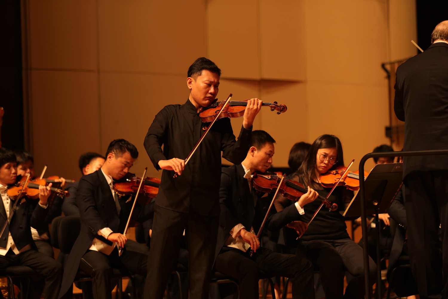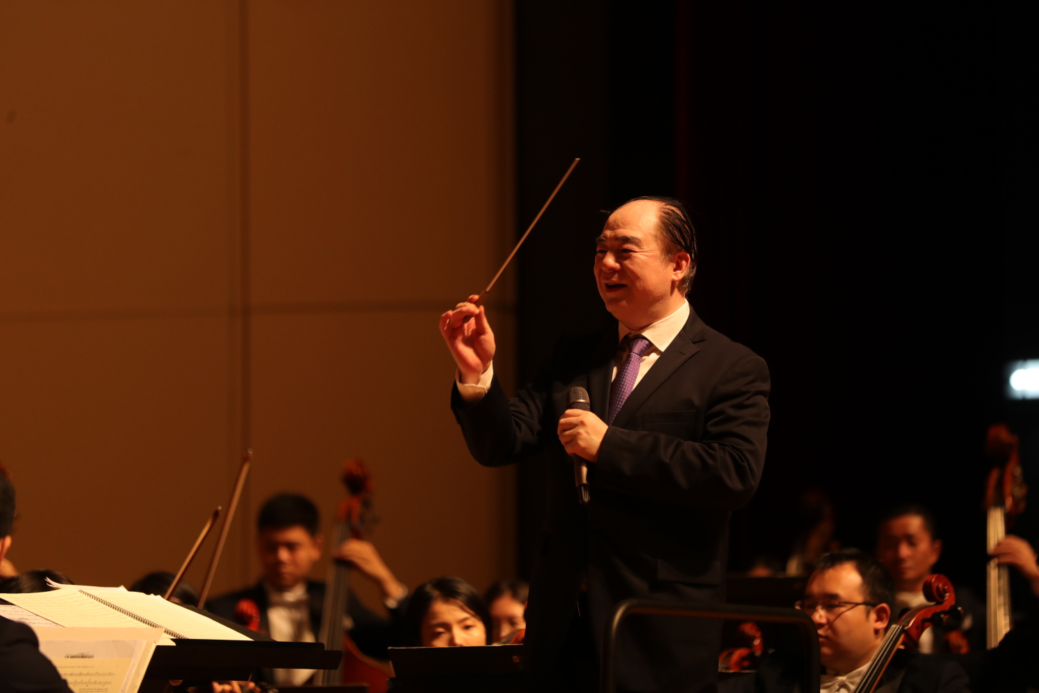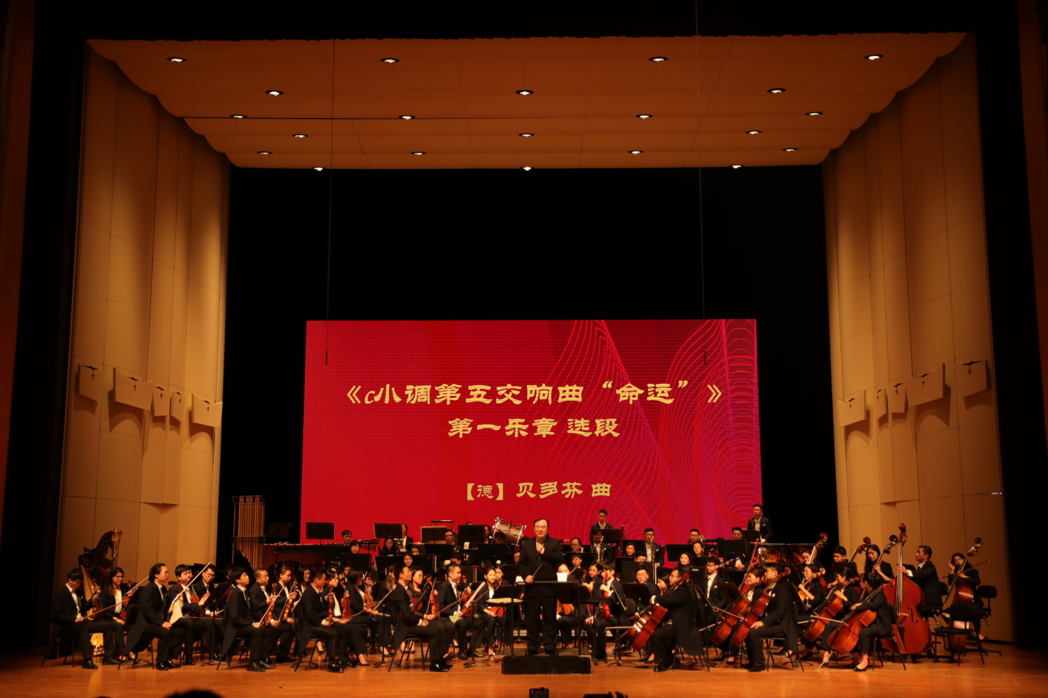开班仪式结束后,随着激昂的《义勇军进行曲》响起,俞峰院长携KY开元集团官网交响乐团及陈曦、宋元明、王传越等一众音乐家,以讲解、演出相结合的方式,给现场的吕梁学员带来了一堂生动的音乐欣赏课。在这堂课上,俞峰院长介绍了横跨交响乐、协奏曲、歌剧、舞剧等多种体裁的10首中外经典音乐作品,包括我国第一部民族歌剧《白毛女》、小提琴协奏曲《梁山伯与祝英台》、民族芭蕾舞剧《红色娘子军》、贝多芬《c小调第五交响曲“命运”》、歌剧《图兰朵》等,并结合党的文艺理论、大量中西音乐史料进行了细致的讲解。俞院长的讲解与音乐家们激情澎湃、震撼人心的音乐深深感染着在座的200多位学员。最后俞峰院长指挥全体演职人员与学员,在《我和我的祖国》的歌声中结束了这堂音乐欣赏课。