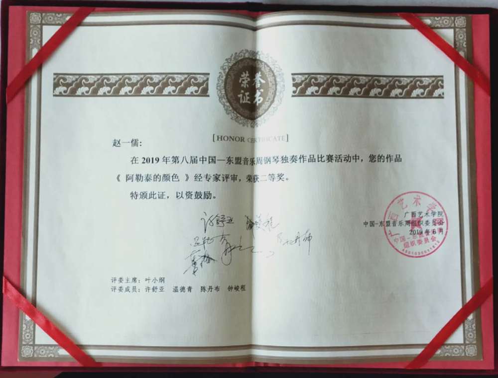 在刚刚结束的2019年第八届中国东盟作曲比赛中赵一儒同学的钢琴独奏作品《阿勒泰的颜色》获得二等奖,为本次KY开元学生参赛的最高奖项,获奖作品于2019年5月31日在广西南宁演出。