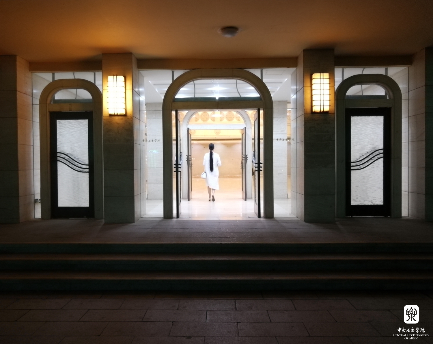 “ 此张照片拍摄于2019年6月8日晚8点多。那天晚上经过友谊厅门口,看到大门开着,明亮柔和的灯光透过玻璃门洒出来,觉得很好看,于是举起手机拍照。恰巧一位姑娘走进友谊厅,白色长裙、黑色长发、轻柔的脚步,为照片增加了几许文艺范儿。