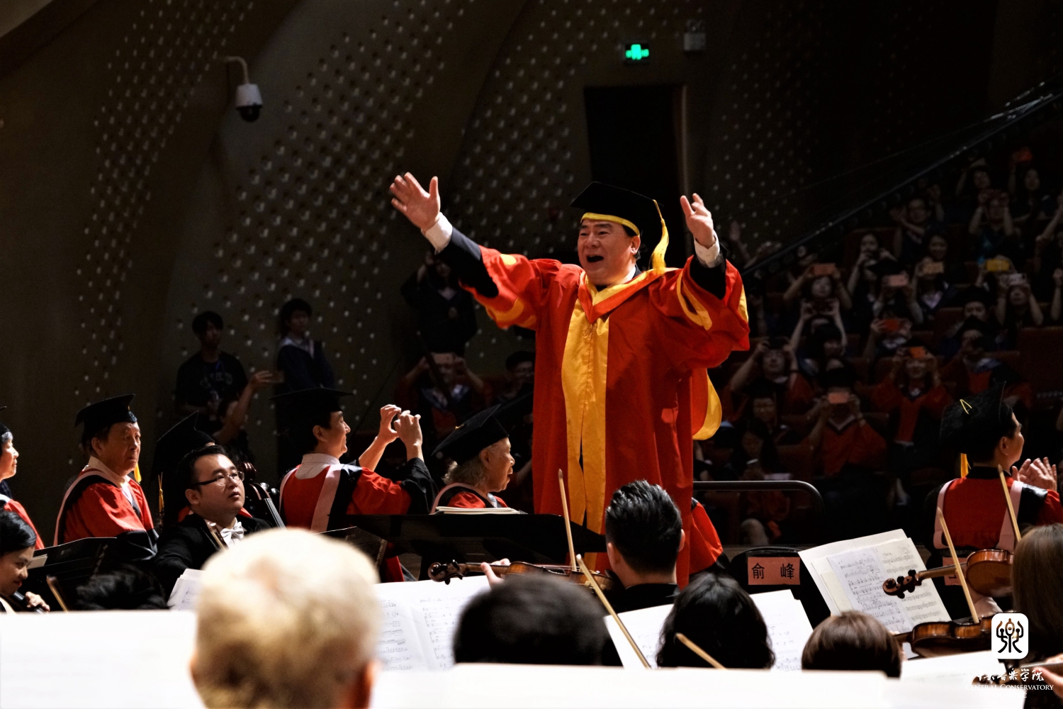 这张照片生动地捕捉到俞峰院长指挥交响乐队演奏时瞬间的表情,具有很强的现场感。从这张照片上看,拍摄的地点应该是学校毕业典礼的现场场景,令人从中感受到此片的新闻性和纪实性。