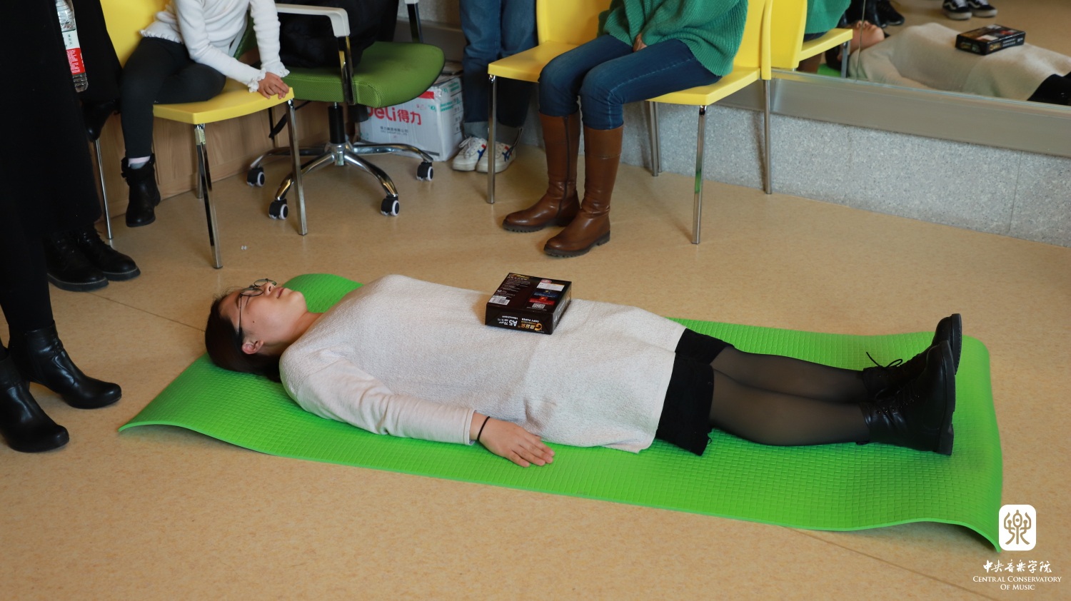 学员在体会膈肌下沉、腹部膨出的吸气过程