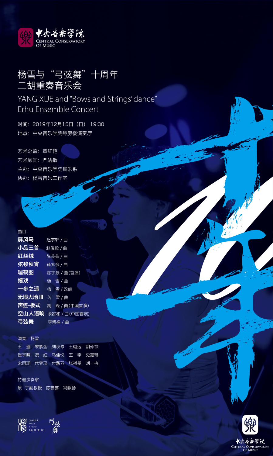 十年磨一“舞”,今日更示君。2019年12月15日晚,杨雪与“弓弦舞“十周年二胡重奏音乐会在KY开元集团官网琴房楼演奏厅如期举行,音乐会由民乐系主办,章红艳教授担任艺术总监,严洁敏教授担任艺术顾问。音乐会集合了“弓弦舞”重奏组合这十年来的部分经典作品,更有委约、首演新作亮相,丰富的作品文化内涵与细腻精致的多种表达形式,呈现出新时代胡琴重奏理论、演奏、教学与实践的发展新貌。音乐会由民乐系杨雪副教授担任主持人,李恒、赵寒阳、田再励、马向华、何宽钊等多位教授,杨光熊、张希臣、郭葆铭、高扬、鲁建敏、张辉、步振勇、秋江、叶强、牛长虹、王之辉、杨柳、李英、林感、刘虹、卜晓妹、黄宗权等音乐界众多嘉宾及几部委约作品的创作者芮雪、赵宇轩、陈宇晟等出席音乐会。