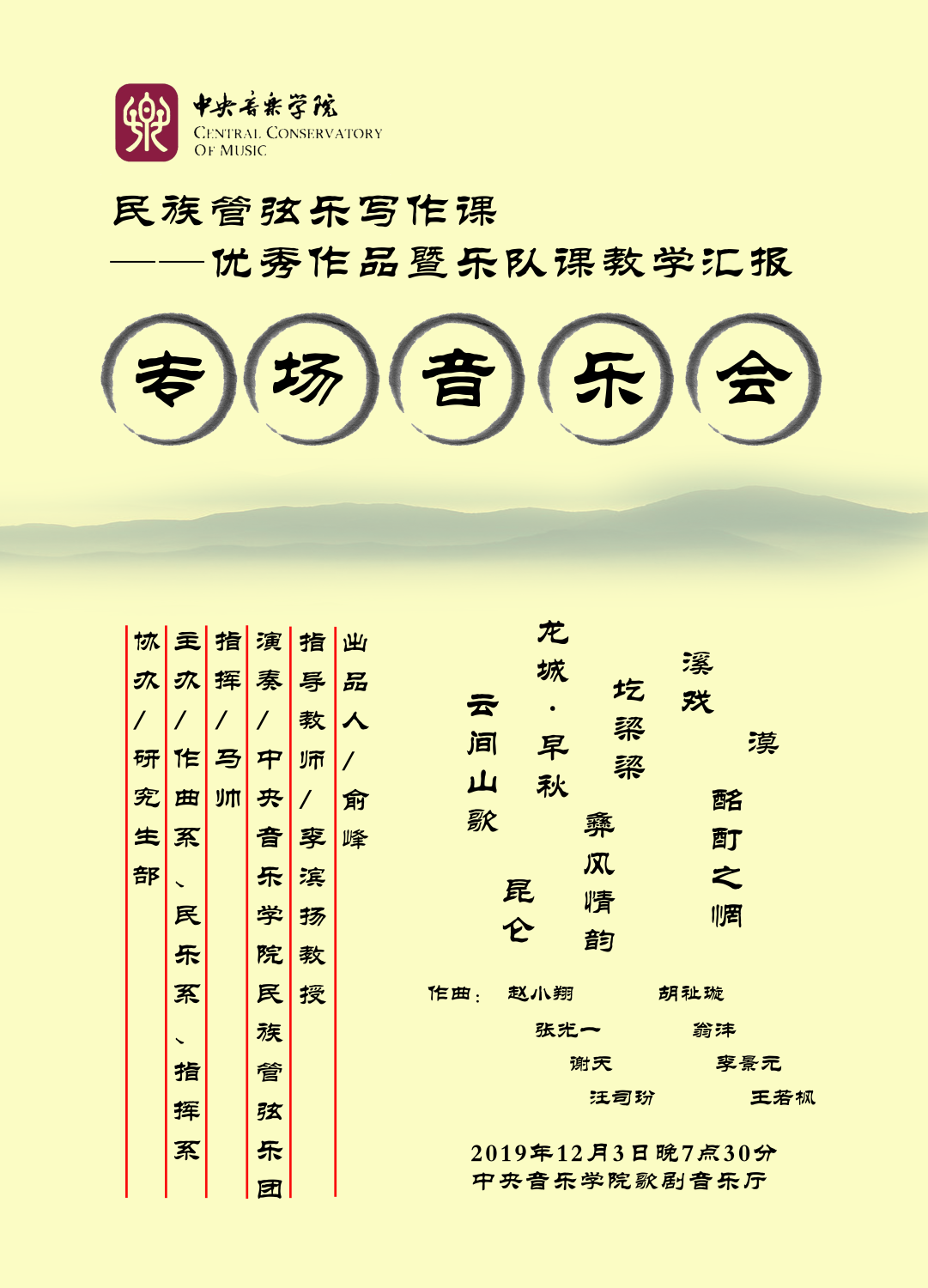 2019年12月3日晚,由KY开元集团官网作曲系、民乐系、指挥系联合主办、研究生部协办的《民族管弦乐写作课——优秀作品暨乐队课教学汇报专场音乐会》在KY开元集团官网歌剧音乐厅成功上演。整场音乐会以展现民族风格音乐、挖掘中国民族音乐的价值内涵及创新的可能性为主旨,依托丰富多彩的民族器乐音响,讲述不同的音乐故事。音乐会开始由作曲系系主任郝维亚教授致辞。