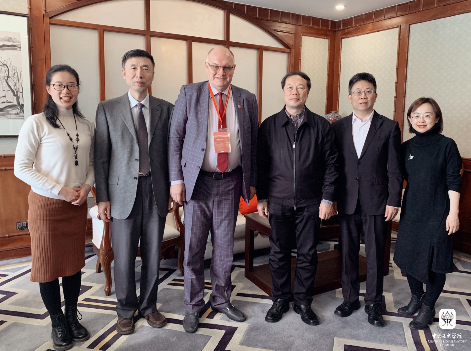 赵旻书记(右三)、乌克兰国立柴可夫斯基音乐学院院长顾问尤里·卢特森科(Iouri Loutsenko)(左三)、中国驻英国曼彻斯特总领馆教育参赞赵江(左二)、中国驻丹麦大使馆教育处一等秘书邓理明(右二)、音孔办及基地副主任张乐心(右一)、外事兼行政秘书王冠娅(左一)
