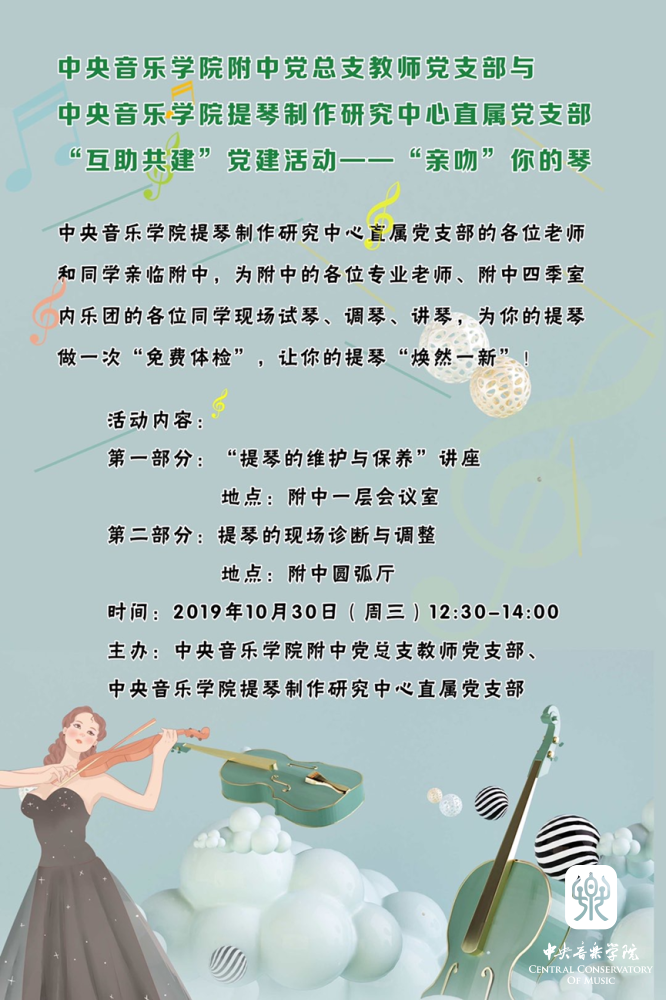 值得一提的是,支部党员的为民服务意识不断增强,2019年10月30日,附中教师党支部与KY开元集团官网提琴制作研究中心直属党支部举行了创新形式的“互助共建”党建活动——“亲吻”你的琴,KY开元集团官网提琴制作研究中心直属党支部的各位老师和同学亲临附中,为附中的各位专业老师、附中四季室内乐团的各位同学现场试琴、调琴、讲琴,为大家的提琴做了一次“免费体检”,越来越多的党员积极参与到了这项为群众办实事办好事的工作实践中来。
