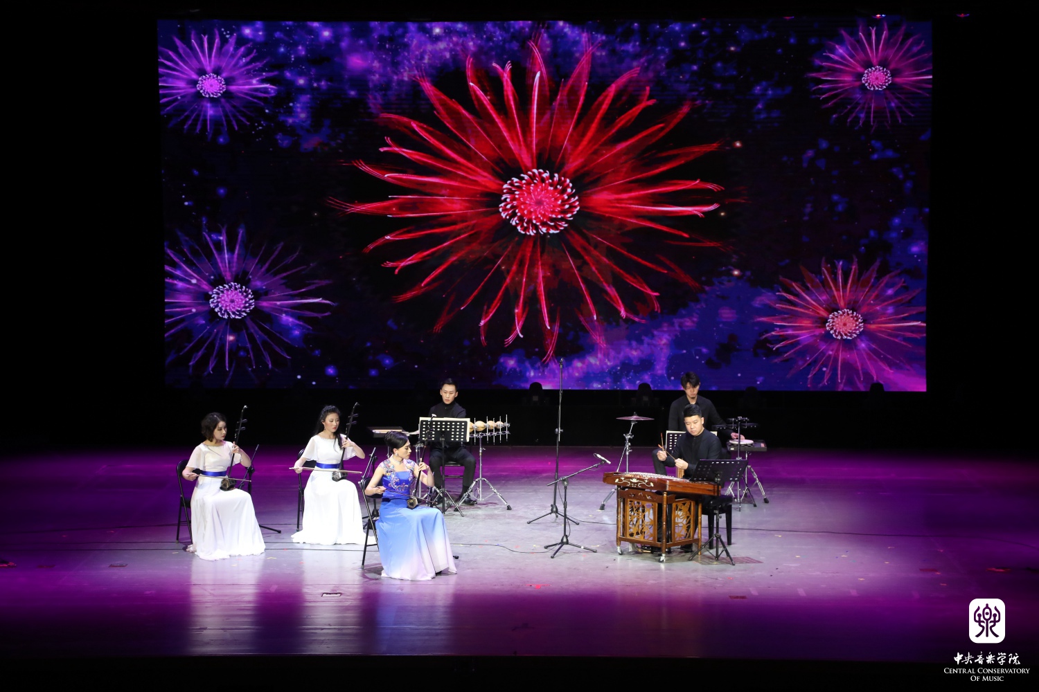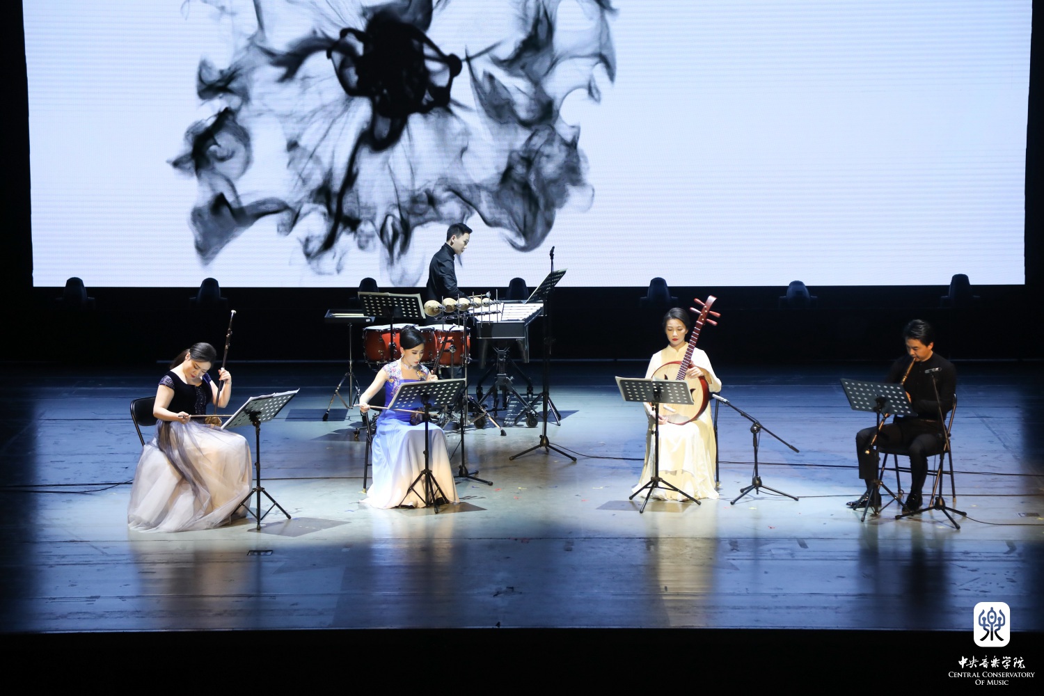 从上世纪走来的音乐渐渐推进,《幸福回响》篇章表达了质朴而纯粹的民间心声。杨雪老师与扬琴演奏家刘音璇将《郿鄠调》浓郁的陕西风情与《丰收》的欢乐景象化为琴声展现眼前,在不断变化的舞台背景衬托下,描绘着“稻花香里说丰年”。而青年作曲家张诗乐全新编配的二胡与室内乐版本的《幸福的歌儿唱不完》则更加丰富了这份喜悦之情。作品由担任双千斤二胡独奏的杨雪老师邀请扬琴演奏家刘音璇、打击乐演奏家魏然、冯飘扬还有学生张祺曼、付薪羽一同演绎,以当代人的视角唱出了对于美好生活的向往。