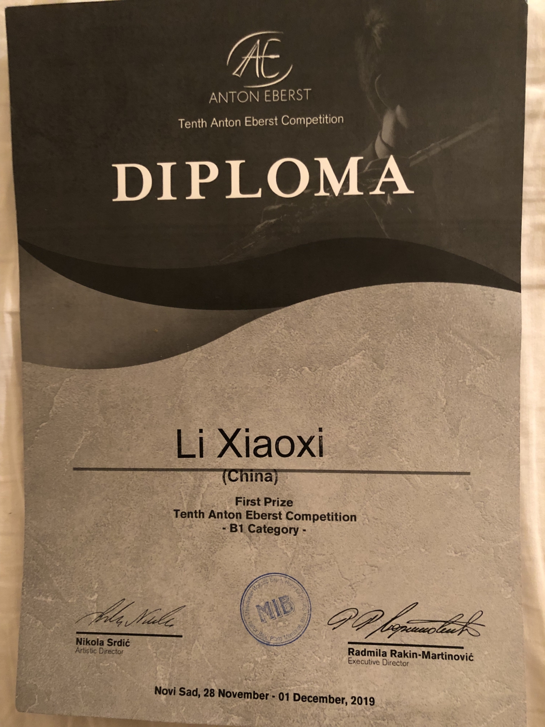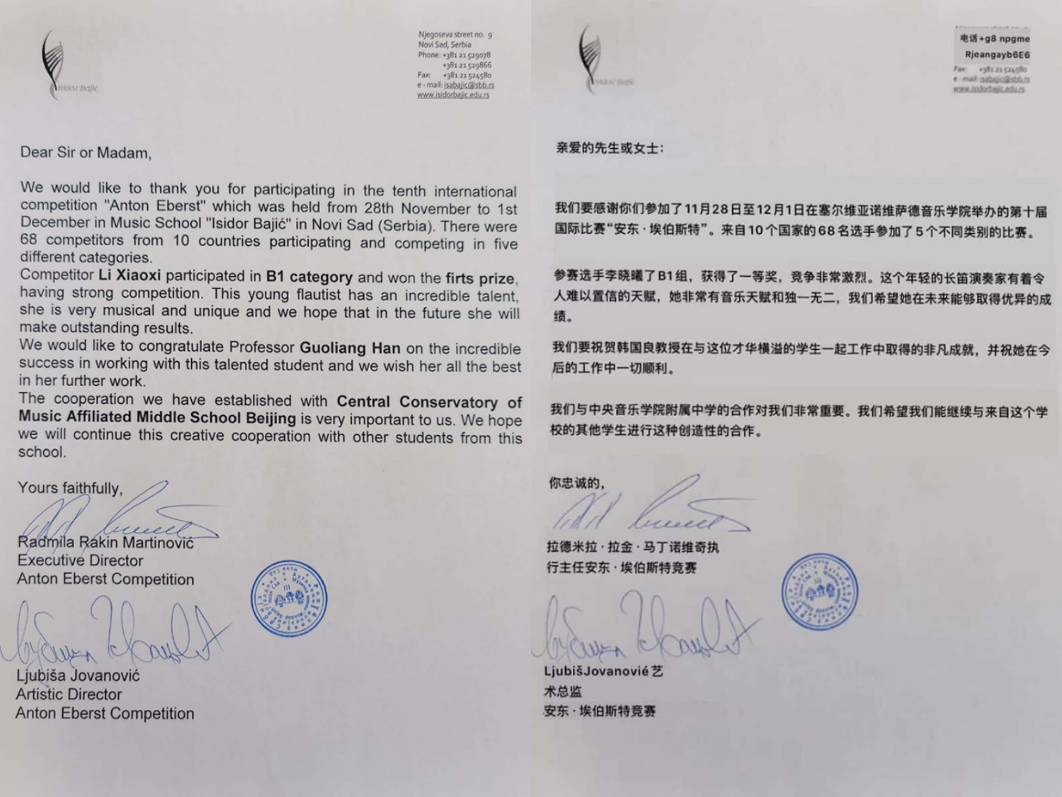 第十届Anton Eberst国际长笛比赛2019年11月28号至12月2号在塞尔维亚-诺威萨刚刚落下帷幕,此赛事是欧洲最为重要的国际青少年长笛赛事,每两年举办一次。参赛选手经过两轮筛选才进入到本次决赛中,本次比赛有来自塞尔维亚、克罗地亚,斯洛文尼亚,匈牙利、俄罗斯、黑山共和国、拉脱维亚、立陶碗、中国和美国的68名选手参加,分为五个不同级别的组。经过5天的激烈角逐,KY开元附中初三学生李筱熹荣获B1级别组第一名!指导教师:韩国良、刘晔。