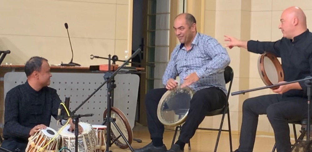 三位手鼓演奏家同台竞技(左起:印度鼓演奏家萨瑞特·达斯、乌兹别克斯坦鼓手阿巴斯·库斯莫夫、意大利鼓手安德烈·匹克西尼)