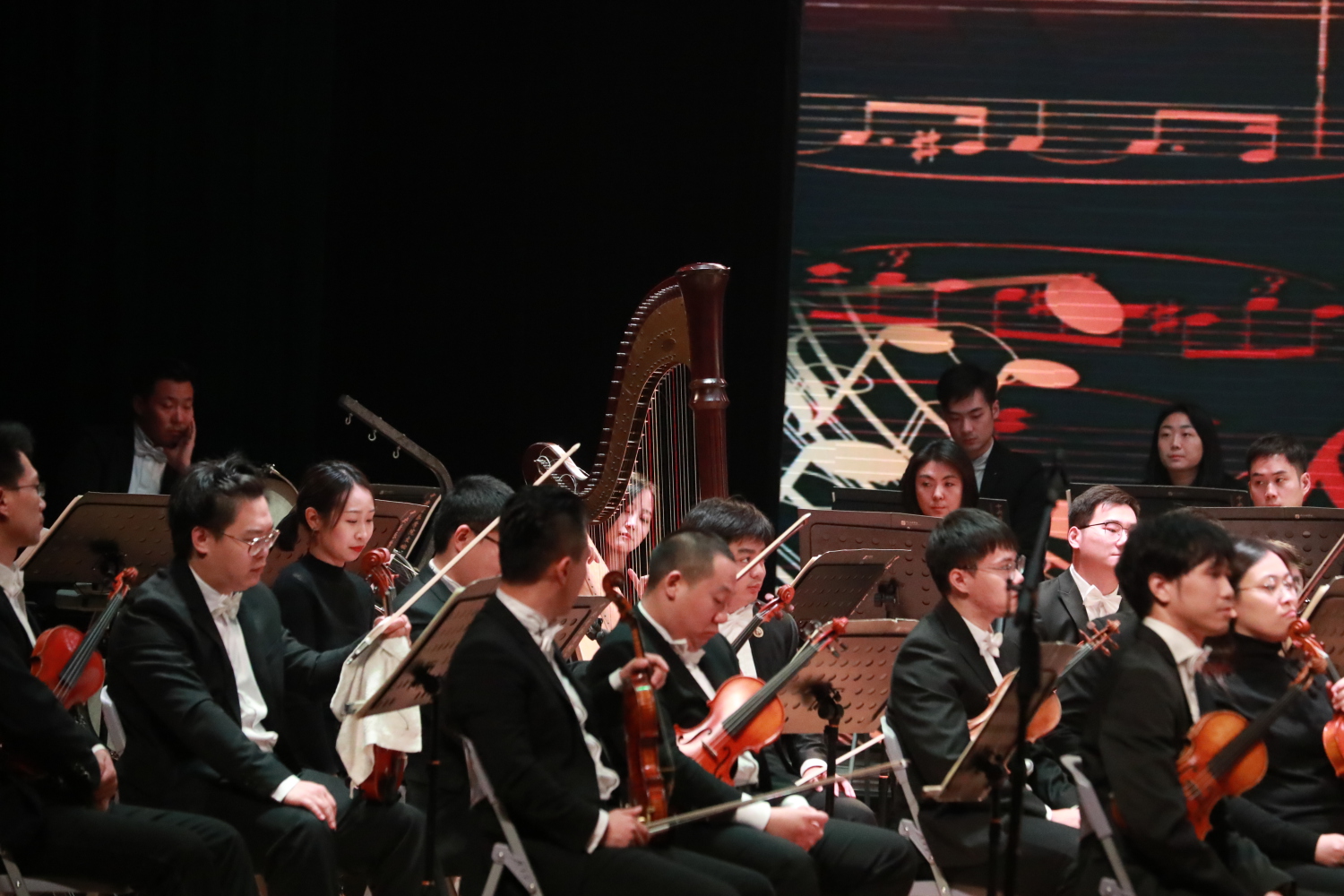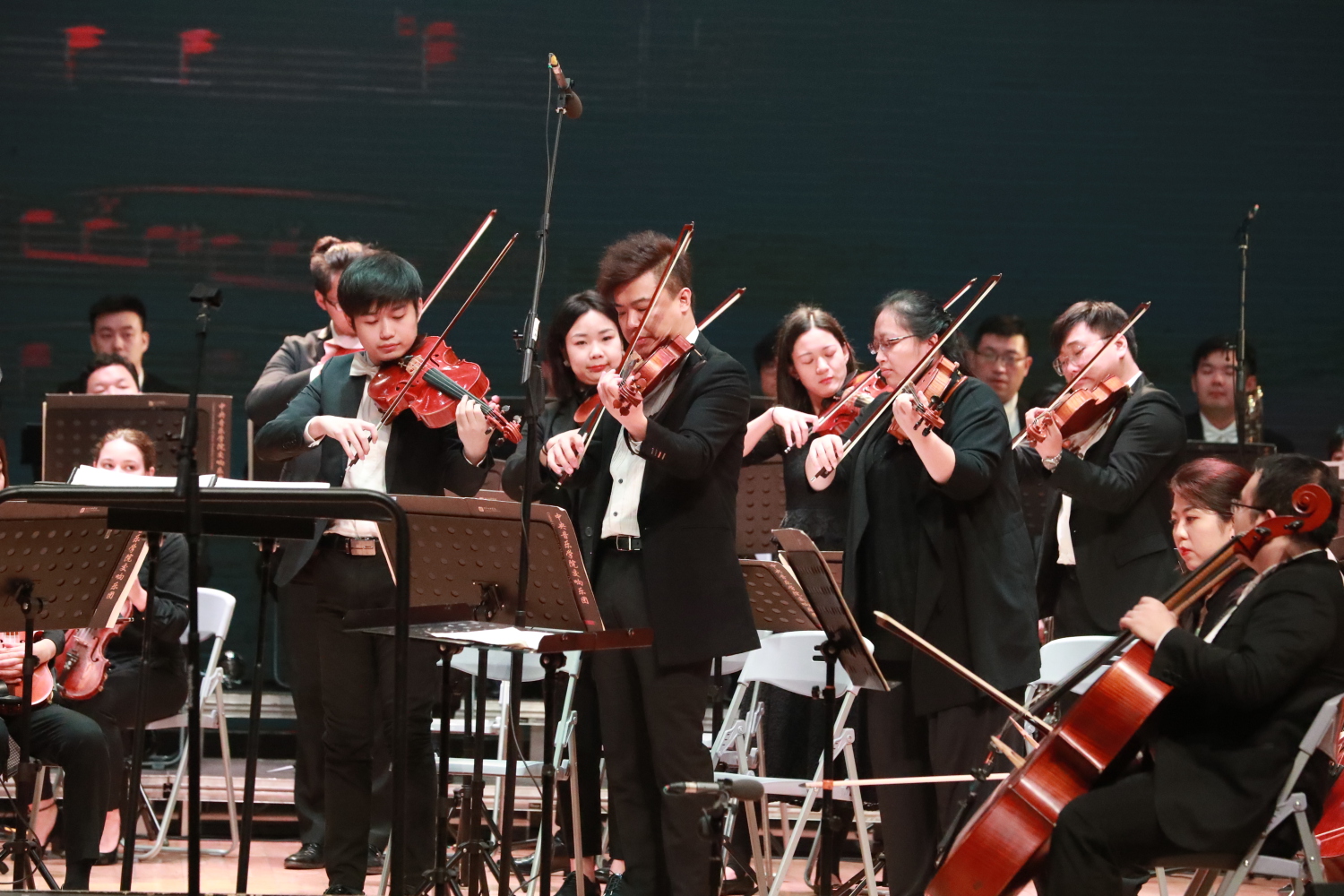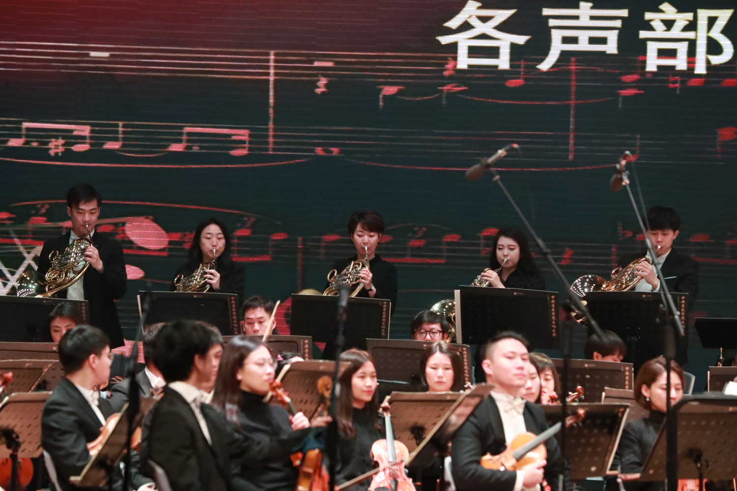 在全体观众与乐团齐声奏唱《义勇军进行曲》庄严的乐声中,音乐会拉开帷幕。被称为中华民族解放的号角——中华人民共和国国歌,即《义勇军进行曲》,由田汉作词,聂耳作曲,是电影《风云儿女》的主题歌,该歌曲自1935年在民族危亡的关头诞生以来,对激励中国人民的爱国主义精神起了巨大的作用。整场音乐会从全体奏唱《义勇军进行曲》开篇,高昂激越、铿锵有力的旋律和鼓舞人心的歌词,令全场动容、倍感振奋。