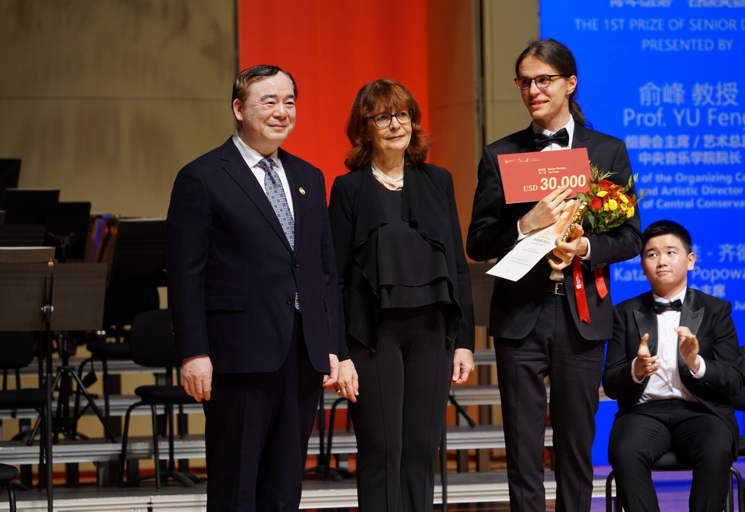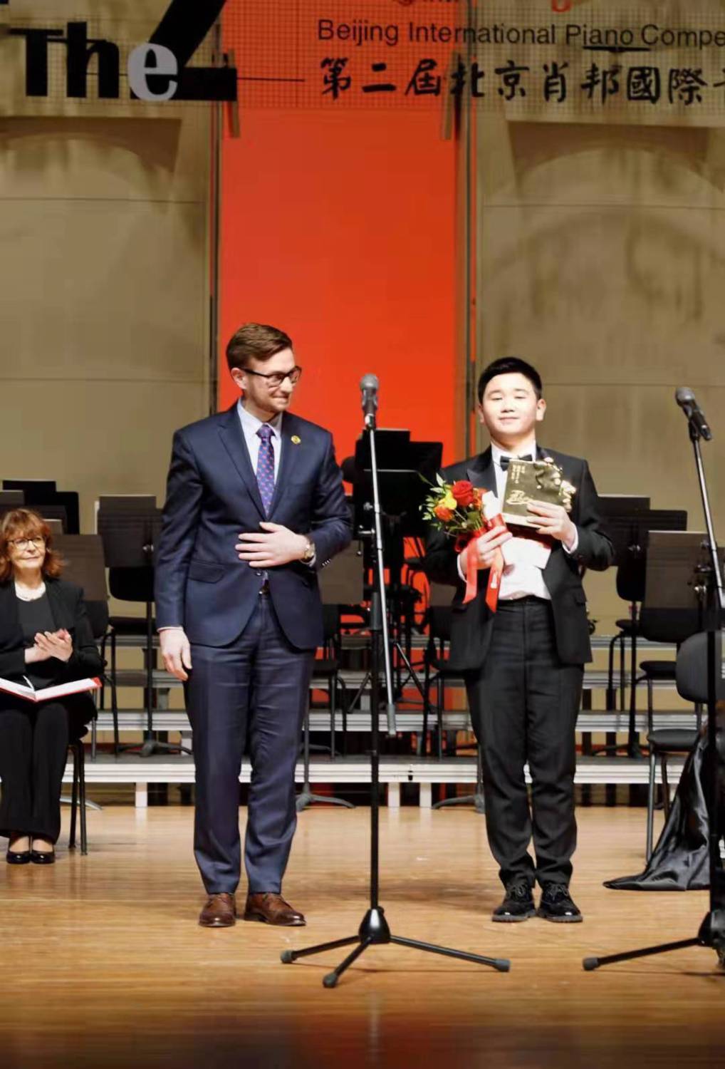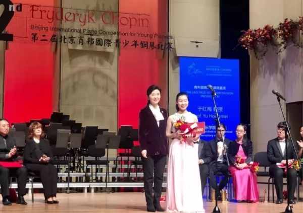 比赛组委会主席、艺术总监俞峰院长和评委会主席波波娃·齐德隆教授为青年组第一名颁奖