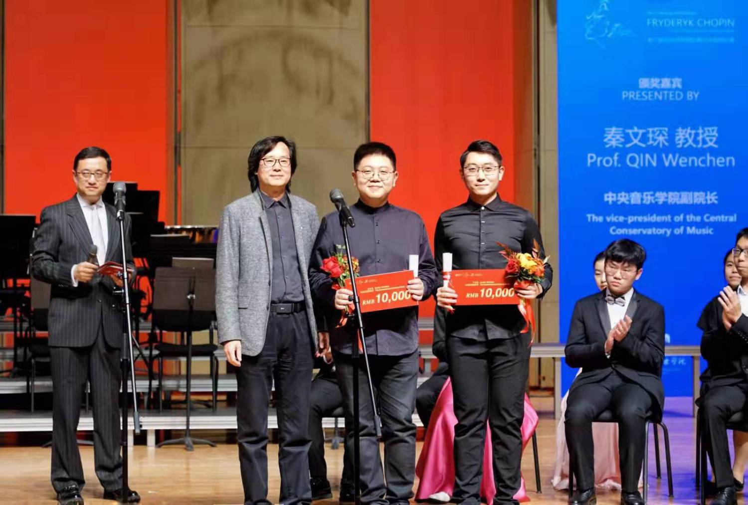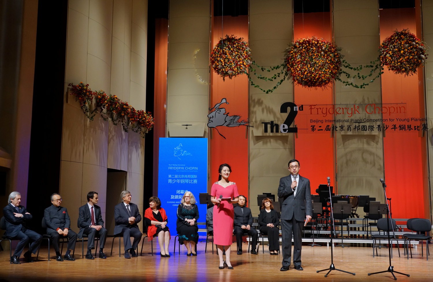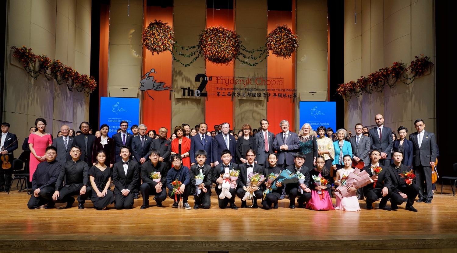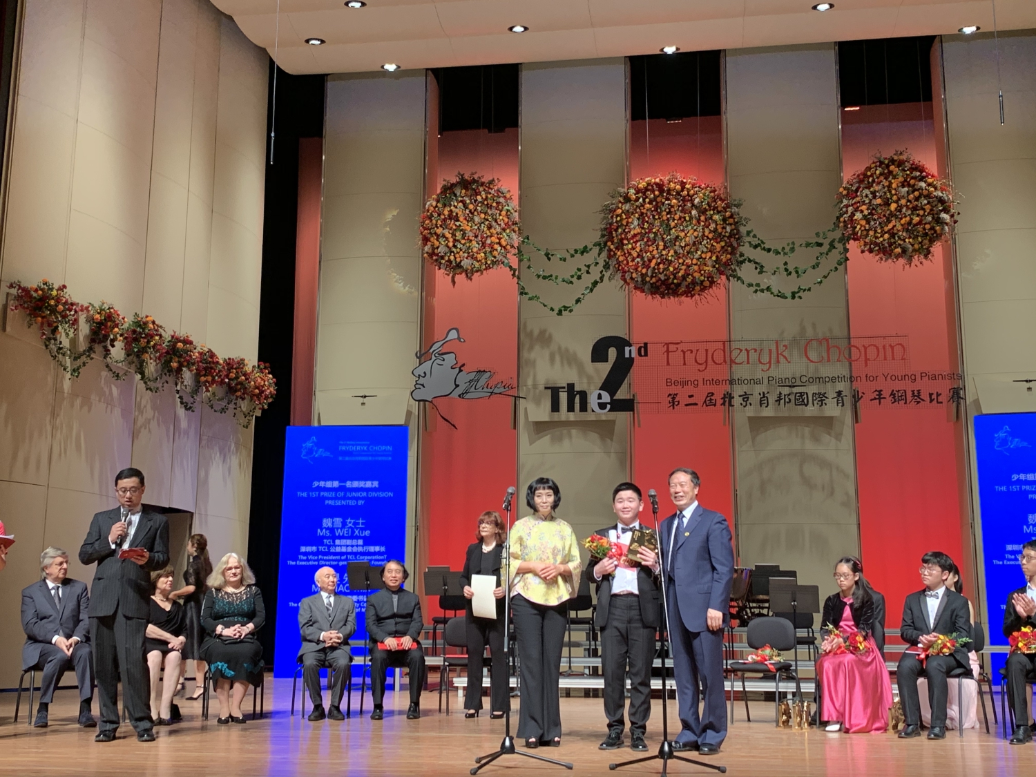 大家晚上好!北京的金秋是硕果累累的季节。历时十五天的比赛今天终于落下帷幕。来自世界各地的61名优秀钢琴选手尽情挥洒才华,在紧张激烈的赛程中,为大家诠释了当代青少年对肖邦音乐的深入理解。你们精湛的技艺博得了赞叹。经过9位评委严格的评审,最终评选出13位优胜者。我代表第二届北京肖邦国际青少年钢琴比赛组委会对取得优异成绩的选手们表示最热烈的祝贺!