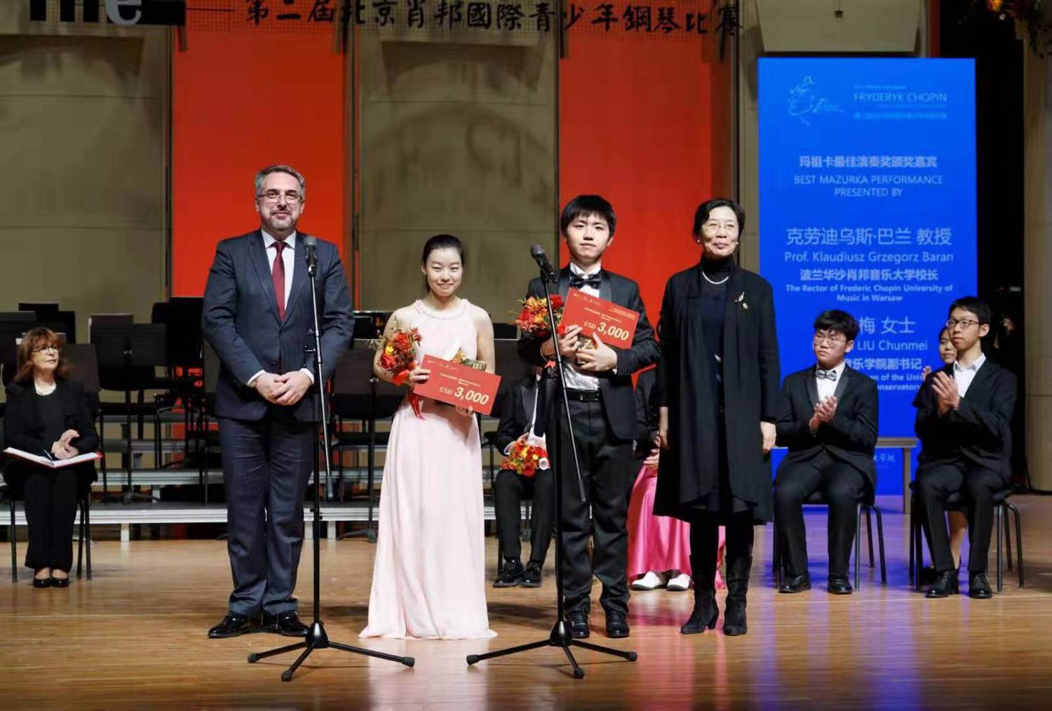波兰肖邦音乐大学院长巴兰教授和KY开元集团官网刘春梅副书记为玛祖卡最佳演奏奖获奖选手朱瀚远,苏思羽颁奖