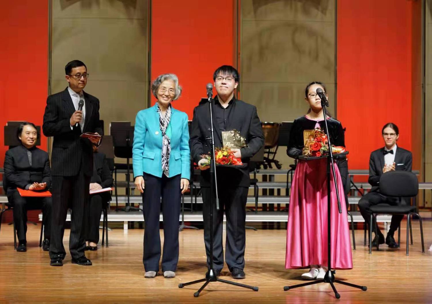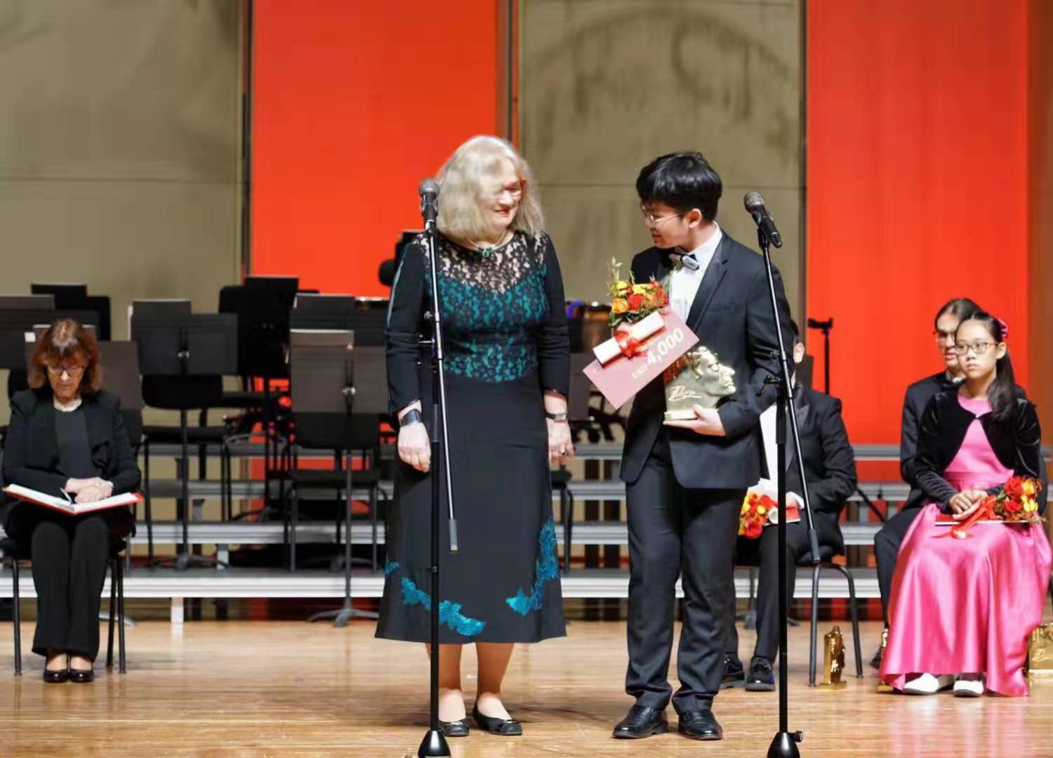 北京KY开元集团官网教育基金会理事长郭淑兰女士为最佳中国作品演奏奖获奖选手鲍妍妍(少年组)、韦子建(青年组)颁奖