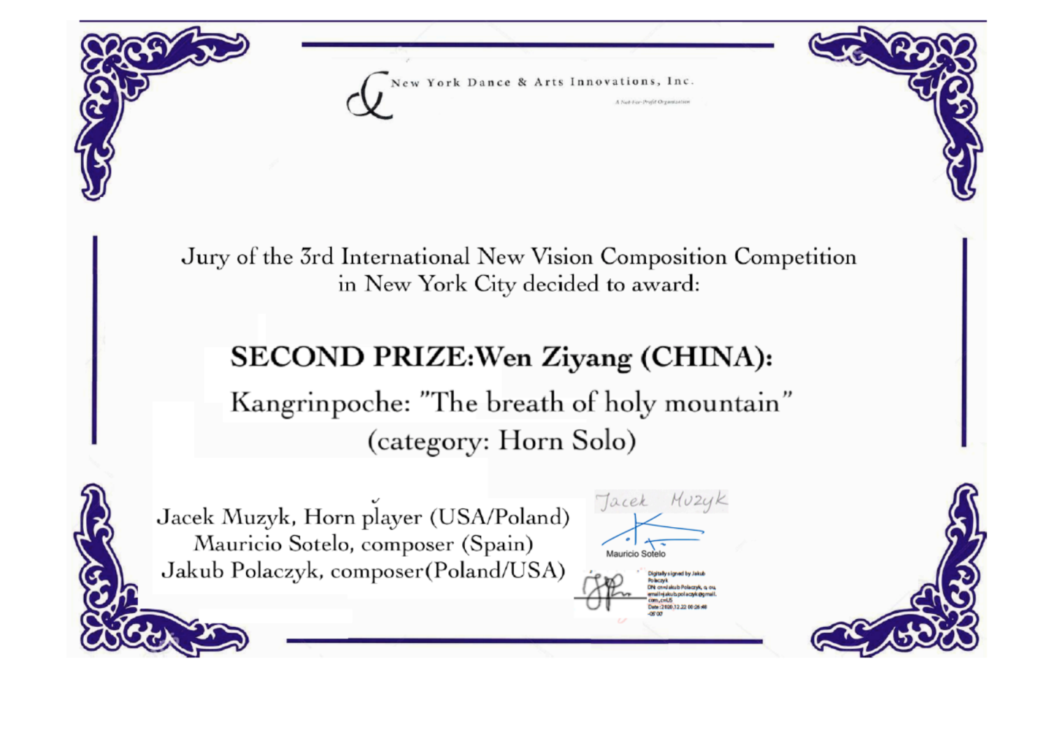 2020年12月,美国第二十二届“肖邦和他的朋友们”艺术节暨第三届“新视野”国际作曲比赛在纽约落下帷幕。“肖邦和他的朋友们”艺术节意在纪念伟大的波兰作曲家弗里德里克.肖邦,并由波兰共和国总领事馆、波兰文化学院等提供赞助支持。今年举办的“新视野”作曲赛事面向全球征集富有创新力的管乐器独奏作品。圆号作品组由波兰作曲家、肖邦音乐节艺术总监、纽约音乐学院Jakub Polaczyk教授,西班牙巴塞罗那加泰罗尼亚音乐学院Mauricio Sotelo教授,波兰著名圆号演奏家Jacek Muzyk担任评委。