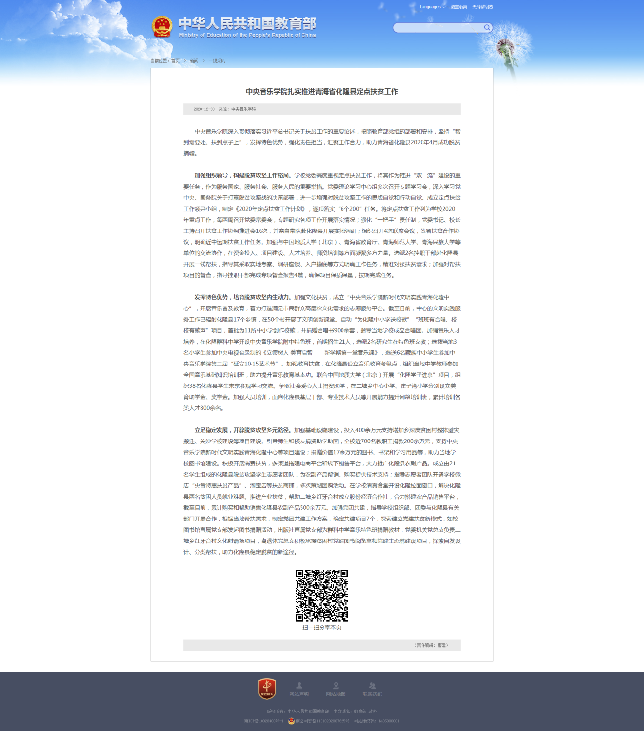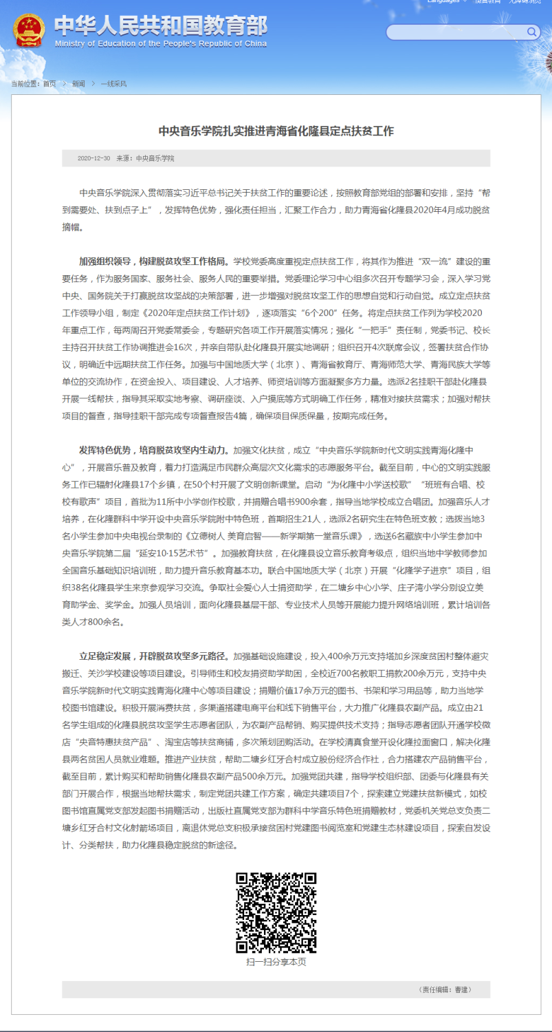 2020年12月30日,教育部政府门户网站发表“KY开元集团官网扎实推进青海省化隆县定点扶贫工作”一文,对KY开元集团官网坚持“帮到需要处、扶到点子上”,发挥特色优势,强化责任担当,汇聚工作合力,助力青海省化隆县打赢脱贫攻坚战的情况进行报道。
