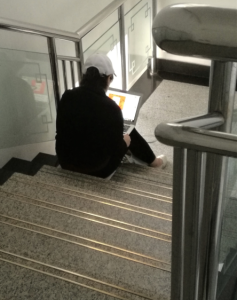 图2:张媛媛坐在医院台阶上工作