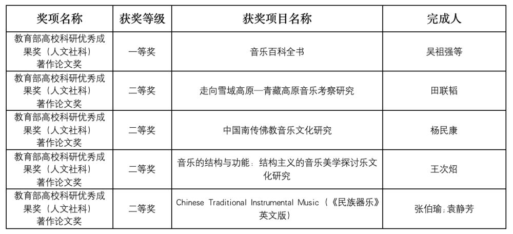 其中,吴祖强等《音乐百科全书》获得论文著作奖一等奖;田联韬《走向雪域高原——青藏高原音乐考察研究》、杨民康《中国南传佛教音乐文化研究》、王次炤《音乐的结构与功能:结构主义的音乐美学探讨》、张伯瑜和袁静芳 Chinese Traditional Instrumental Music(《民族器乐》英文版)获得论文著作奖二等奖。