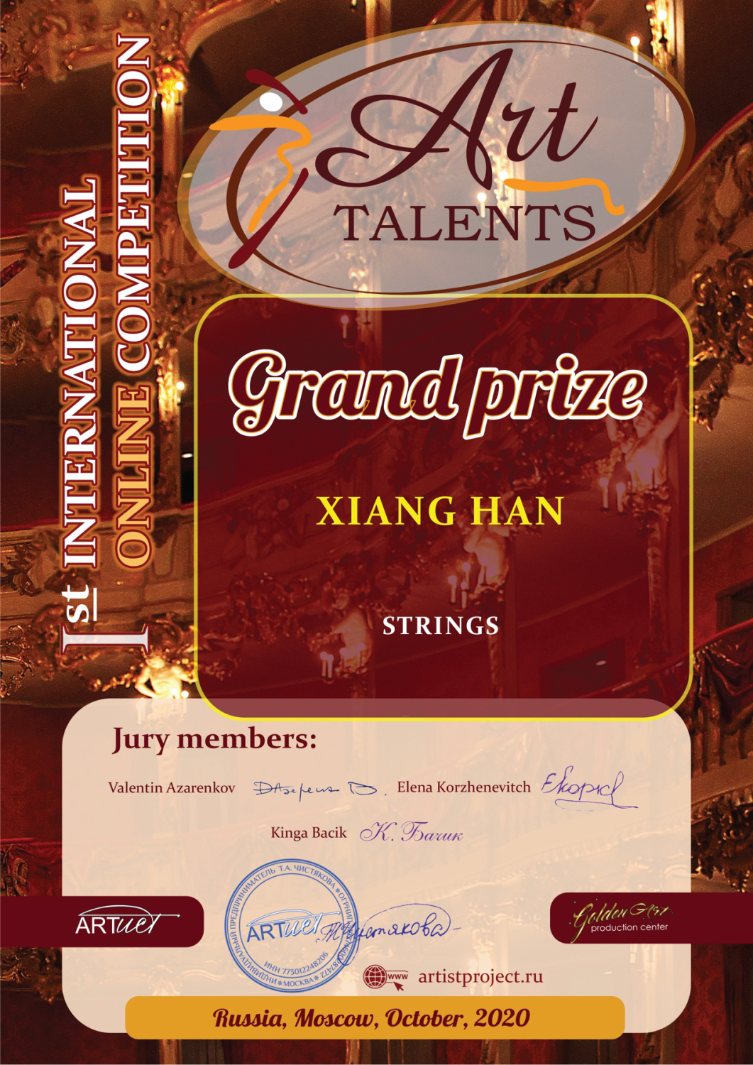 2020年8月获英国 新菁英国际音乐比赛弦乐组第一名:技巧名家奖,为弦乐组全组最高奖。并接受英国皇家音乐学院副董事的采访,在国内外各大媒体中发布。同月,获美国国际音乐公开赛,独奏组与青年精英组双料冠军。