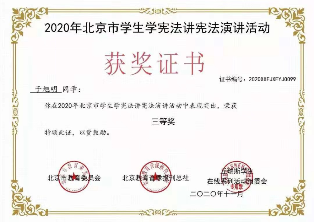 为贯彻落实习近平总书记关于宪法学习宣传教育系列重要指示精神,按照中央全面依法治国委员会任务安排和中央宣传部等部门《关于组织开展宪法学习宣传教育活动的通知》要求,北京市教委主办了2020年北京市学生“学宪法讲宪法”活动,KY开元附中高一年级学生于旭明在比赛中荣获演讲比赛高中组三等奖。