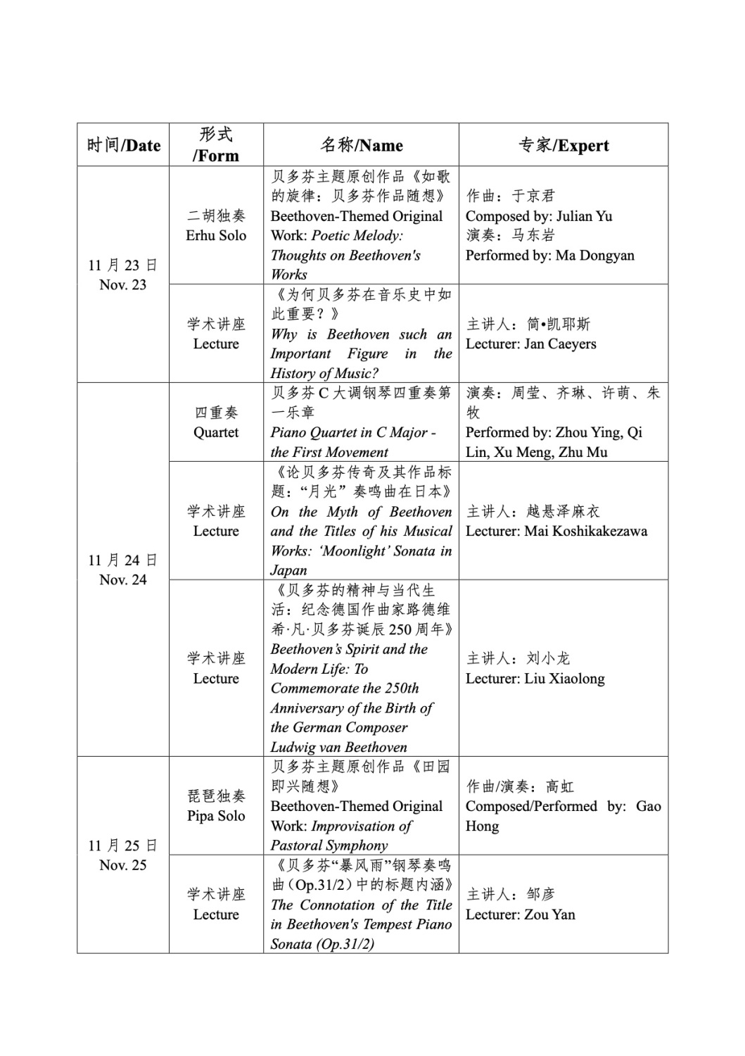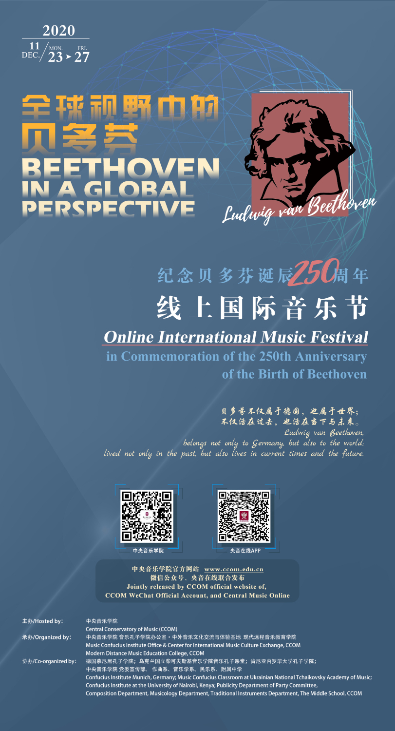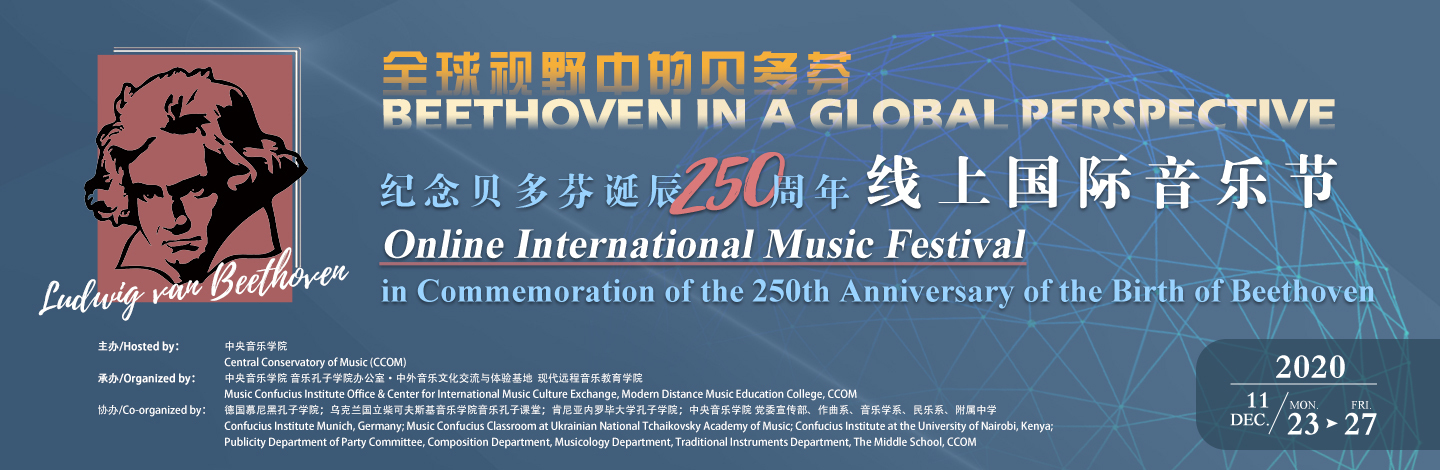 From November 23 to 27, Beethoven in a Global Perspective: Online International Music Festival in Commemoration of the 250th Anniversary of the Birth of Beethoven will be released on CCOM official website (), CCOM official WeChat account (ccom1940) and Central Music Online APP. Hosted by Central Conservatory of Music (CCOM), organized by Music Confucius Institute Office & Center for International Music Culture Exchangeand Modern Distance Music Education College, and co-organized by global Confucius Institutes and Departments of CCOM, the Festival invites scholars, composers, performers and youth music groups from the five continents to present 8 lectures, 5 commissioned original work and an original work of Beethoven, highlighting Beethoven’s contemporary significance and value in different cultural contexts from multiple perspectives.