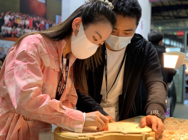 研一学生丁奕瑄正在协助顾客感受提琴制作操作过程