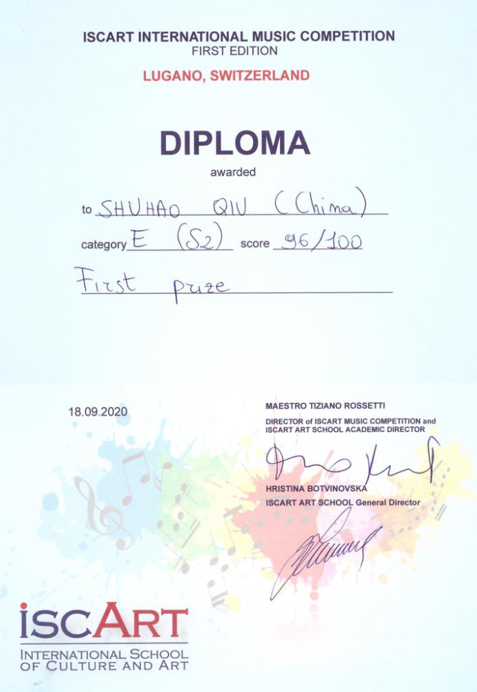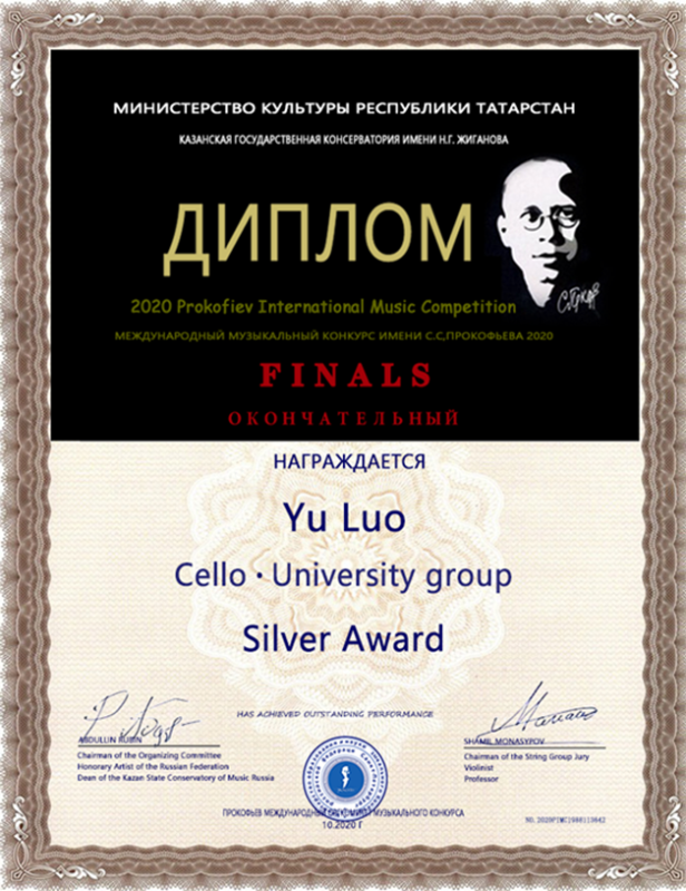 2020年获得普罗科菲耶夫国际音乐节专业少年组银奖(金奖空缺)
