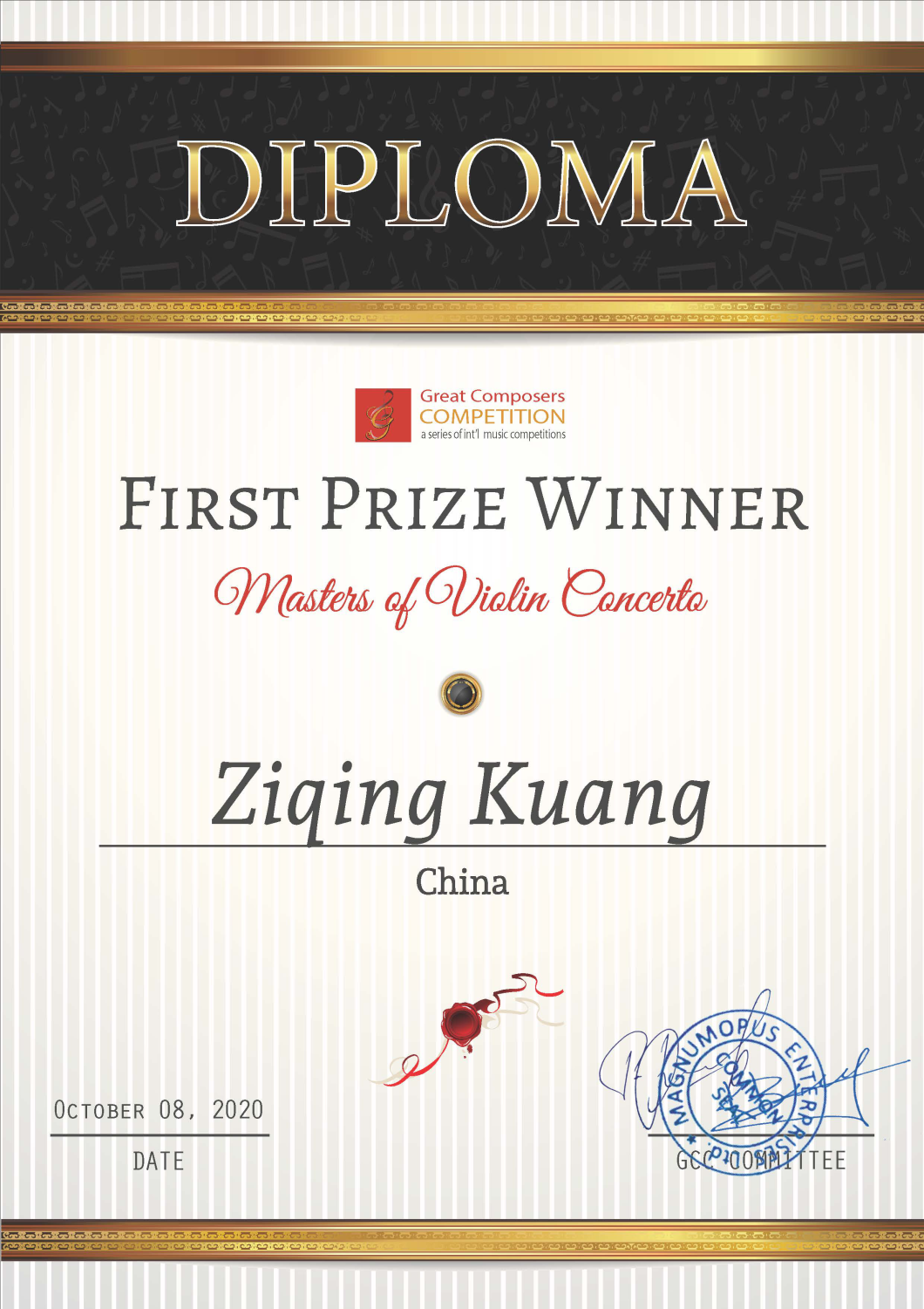 2020年8月获英国 新菁英国际音乐比赛弦乐组第一名:技巧名家奖,为弦乐组全组最高奖。并接受英国皇家音乐学院副董事的采访,在国内外各大媒体中发布。