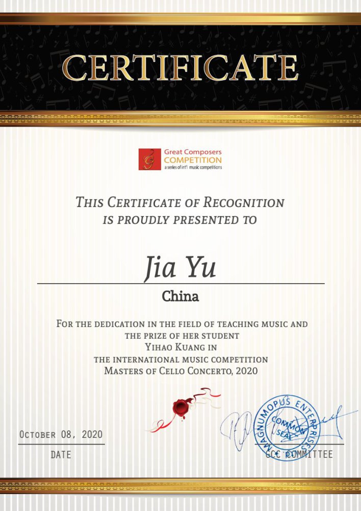 2020年8月荣获第二届“Cello Family”国际大提琴比赛少年组第一名、专业重奏组第一名;
