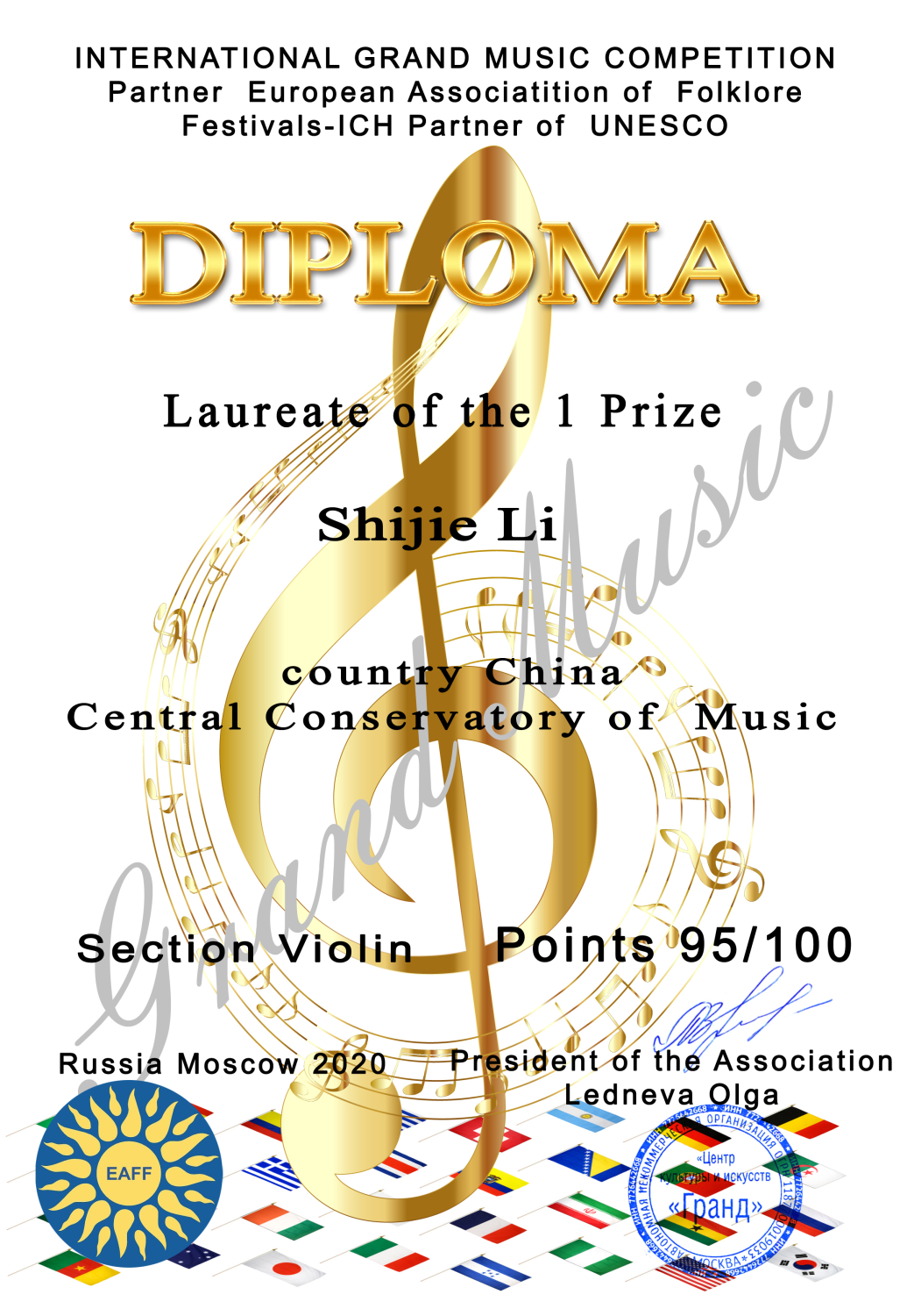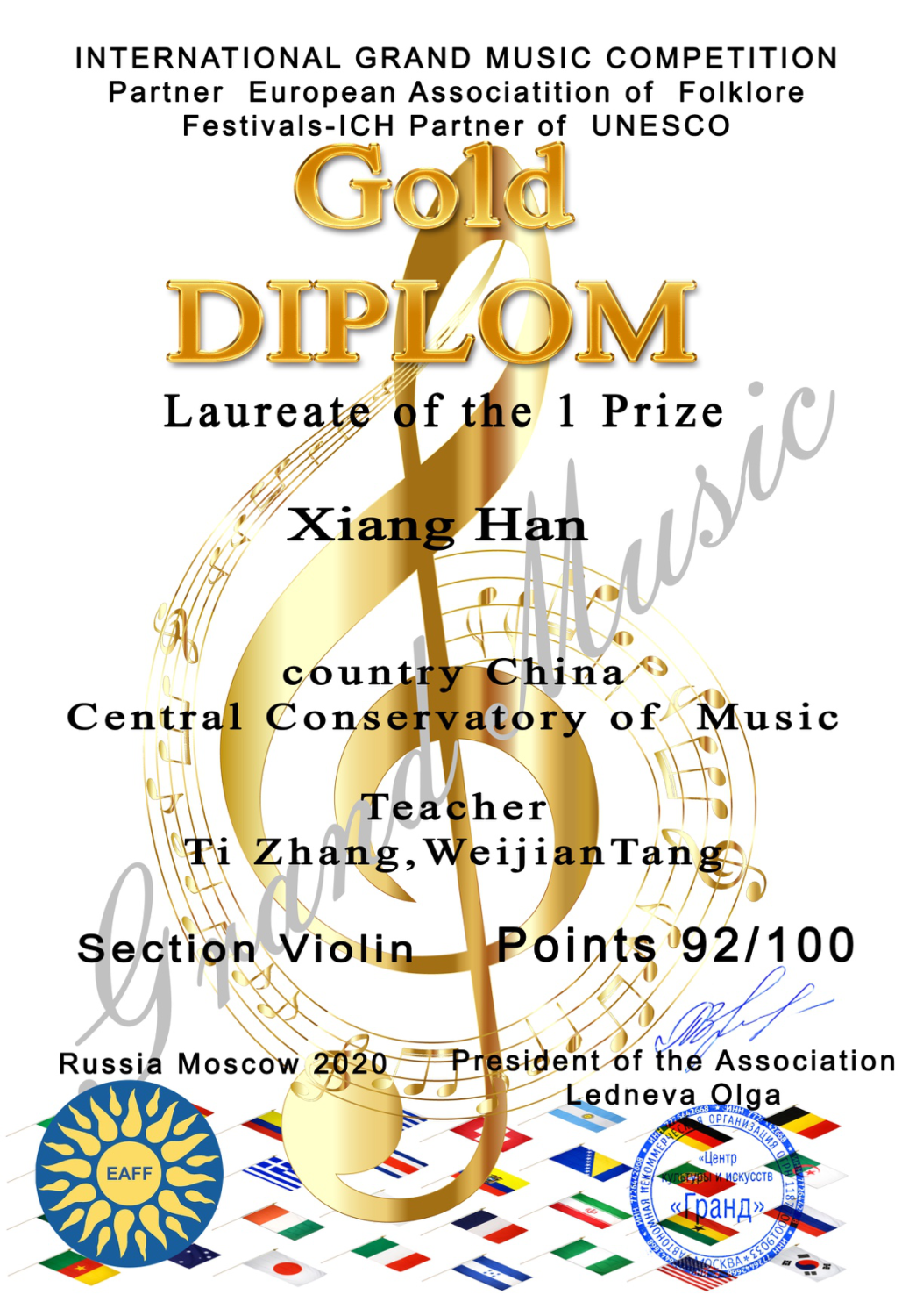 管弦系二年级BOB小提琴专业韩湘荣获俄罗斯莫斯科国际精英音乐大赛专业音乐家组金奖