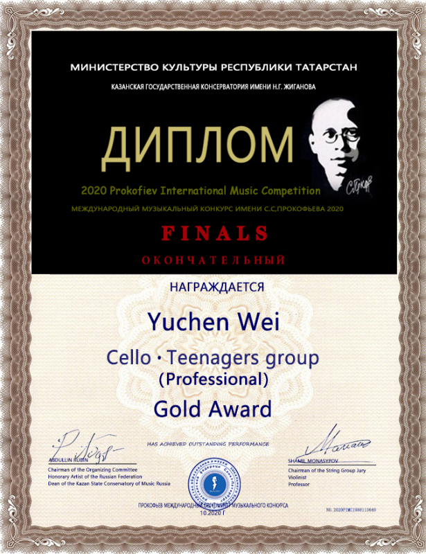 2020年获得普罗科菲耶夫国际音乐大赛大提琴少年专业组唯一的金奖。