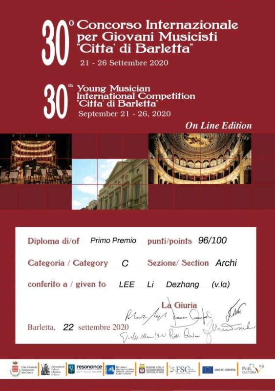 2019年5月在29th young musician international competition “Città di Barletta”29届意大利青少年国际音乐家大赛弦乐比赛中荣获青少年组第一名,并获得LARSEN琴弦赞助一年;