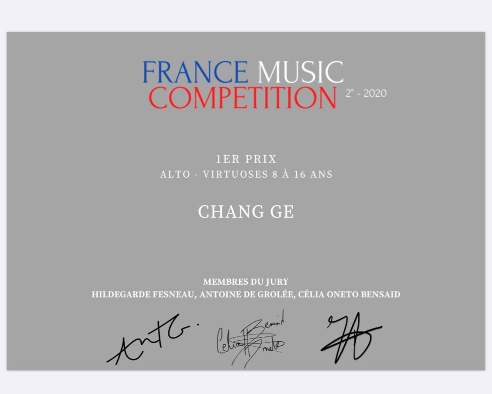 2020年9月荣获France Music Competition 2020法国音乐比赛中提琴少年艺术家组第一名。