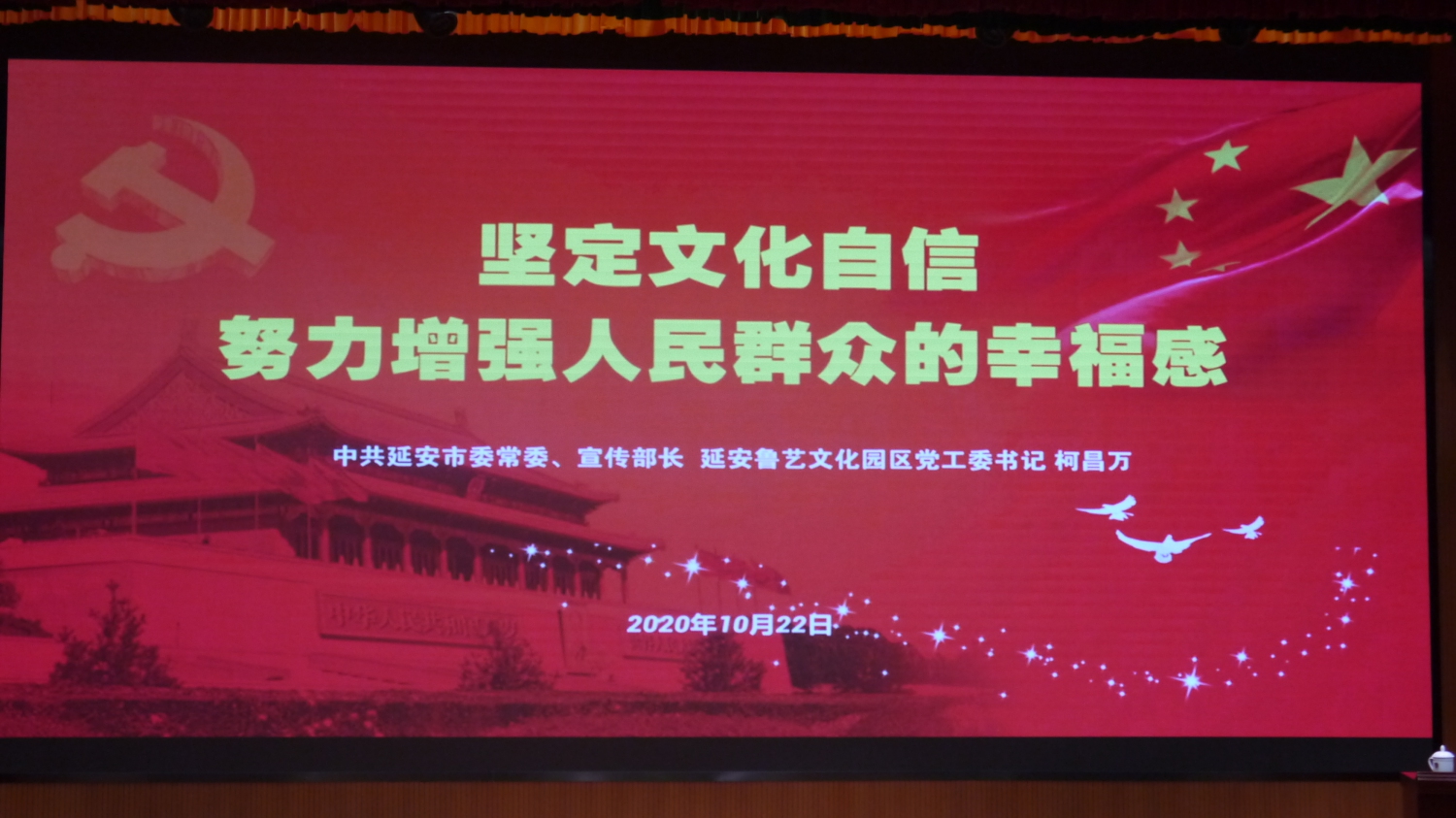 10月22日下午,中共延安市委常委、宣传部部长、延安鲁艺文化园区党工委书记柯昌万同志讲授的《坚定文化自信,努力增强人民群众的幸福感》讲座举行。在长达三小时的讲座中,柯部长从一张“满满的幸福感”陕北老人照片讲起,紧紧围绕“坚定文化自信”,用历史的眼光和发展的视角,用生动活泼的语言,结合鲜活的人物故事娓娓而谈。从哲学思维深度解读了习总书记的“奋斗幸福观”、马克思主义的“劳动幸福观”;探讨了关于幸福的追求和文化解读,深入浅出地阐述了幸福感的深刻内涵、价值取向、现代意义。