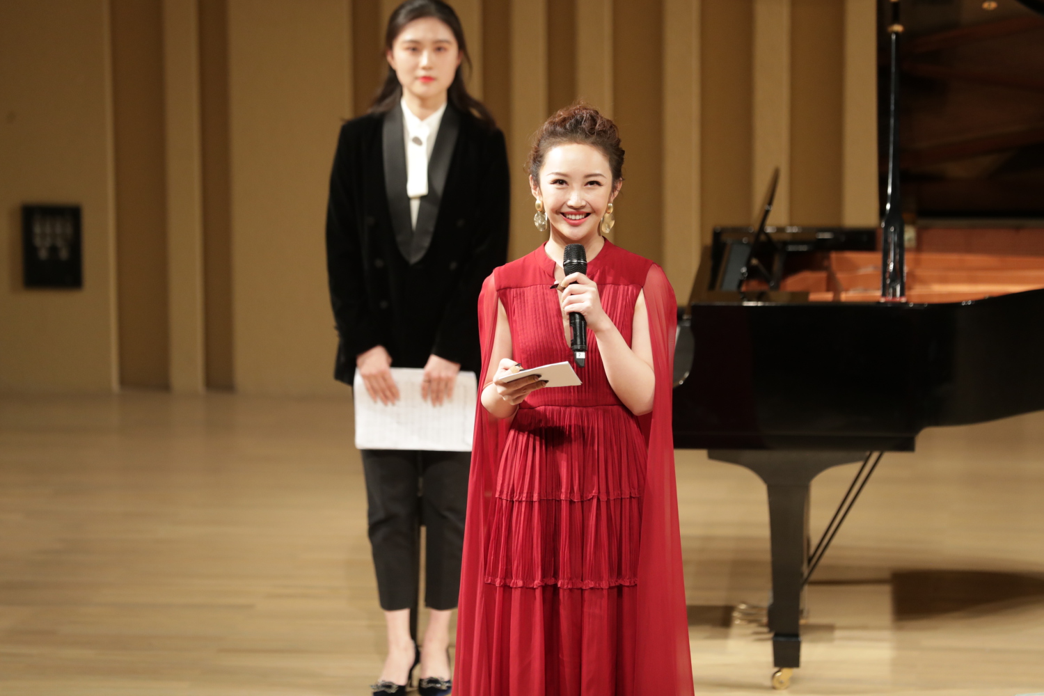 “今天我们将为大家演奏柴可夫斯基的作品《胡桃夹子》。柴可夫斯基是俄罗斯著名作曲家,大家比较熟悉的芭蕾舞剧《天鹅湖》就是他的作品。《胡桃夹子》在初创时也是芭蕾舞剧的配乐,现在我们将演奏改编的钢琴四手联弹组曲其中的第三、第四、第七段'糖果仙子舞曲''俄罗斯舞''芦笛之舞'。”