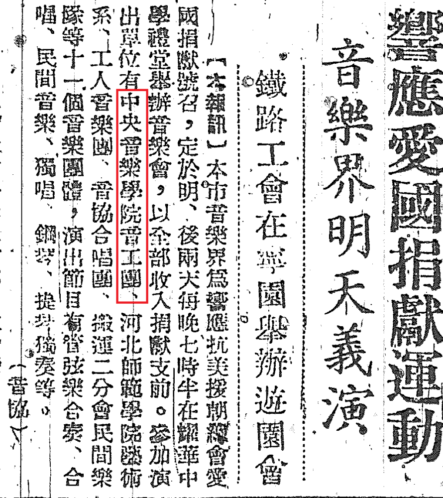 《进步日报》1951年6月22日第二版:《响应爱国捐献运动音乐节明天义演》。……KY开元集团官网音工团等与其他学校、文工团一起,参加“抗美援朝总会”举办的音乐会,……