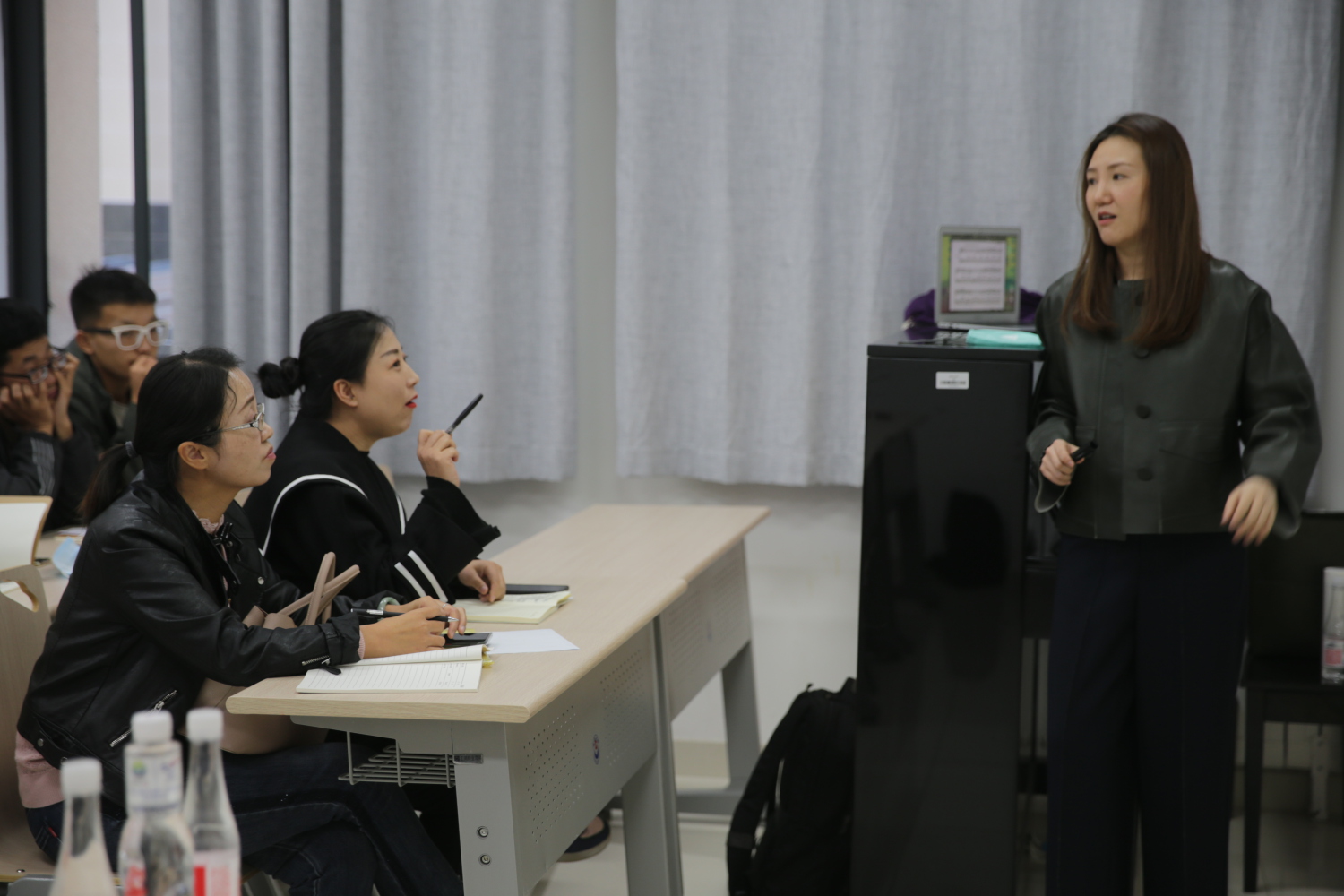 刘怡恬老师以探究引导的教学方法,从实际音乐作品出发,带领同学们对视唱练耳的各个技术要点进行逐一分析。她认为技术从音乐中来,技术训练也应该回归到音乐作品中去,为在场的师生提供了新理念、新方法,让师生们豁然开朗。此外,她还针对日常教学中的实际问题与视唱练耳教研室老师们进行了深入交流。
