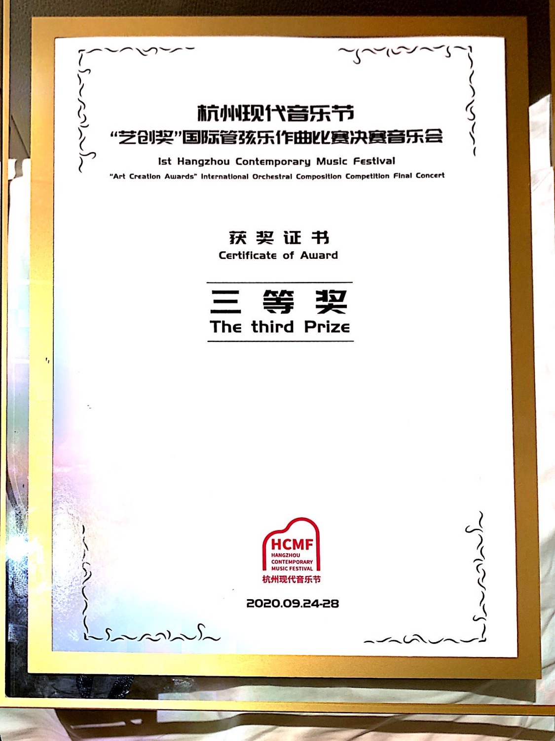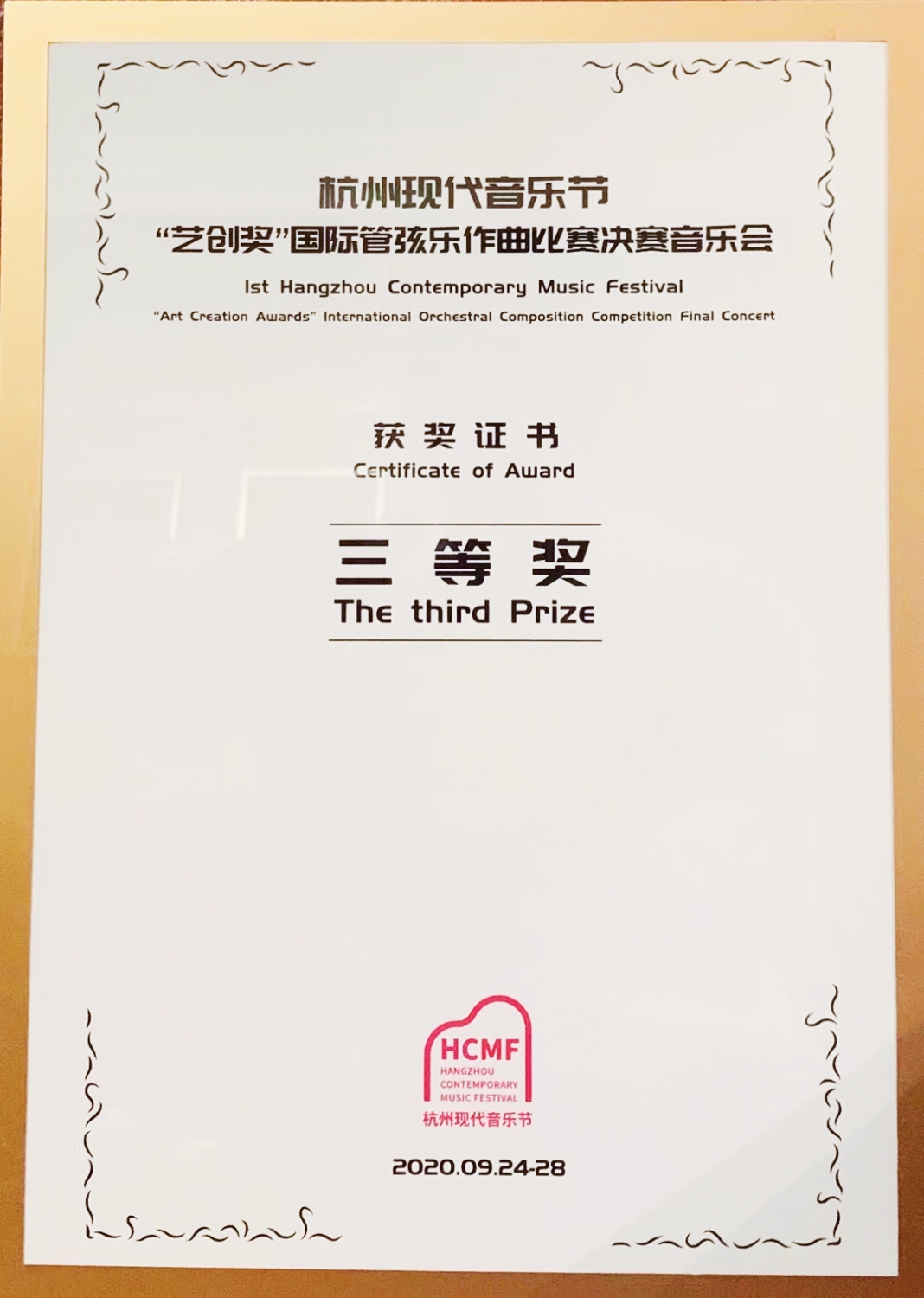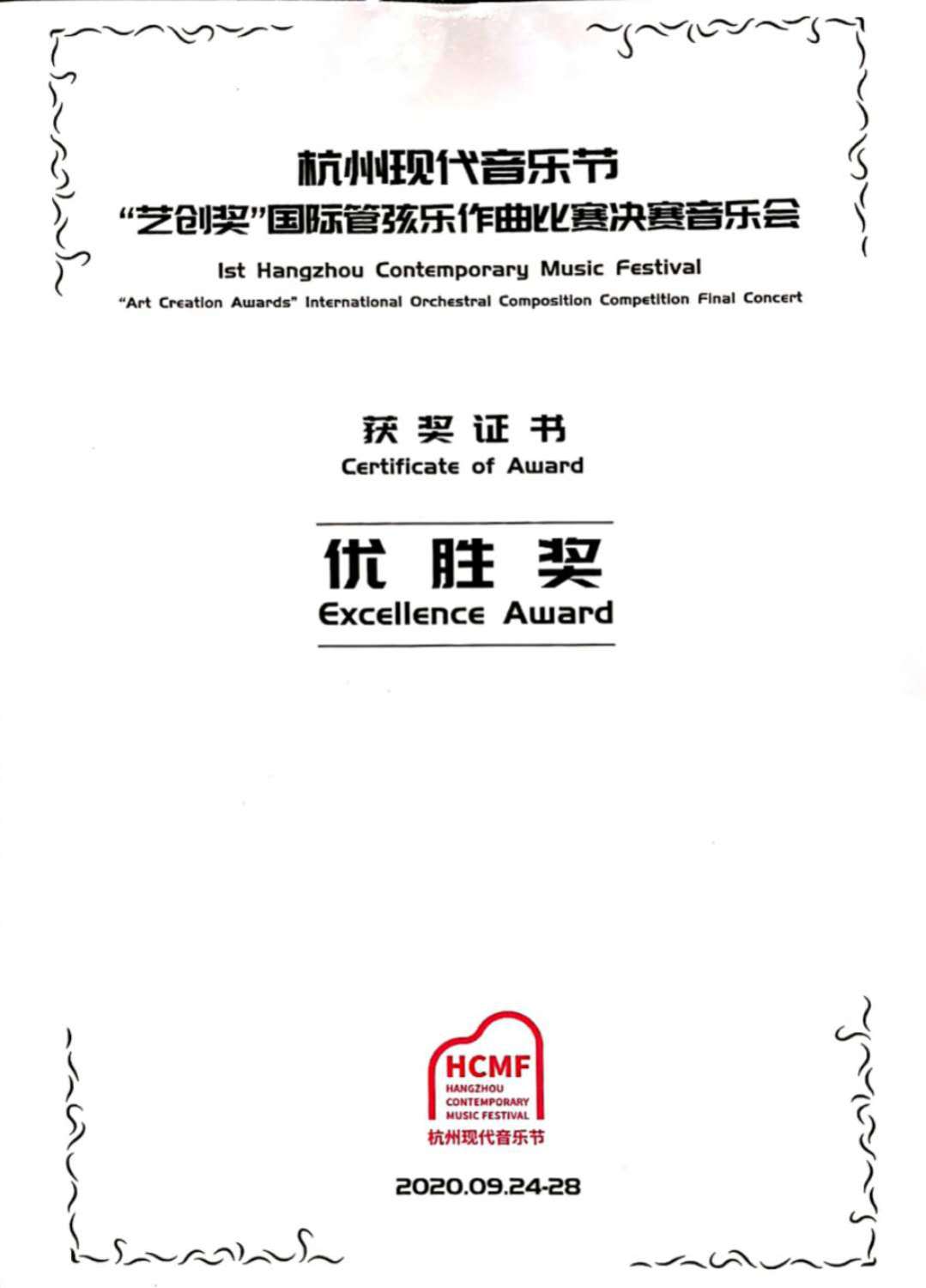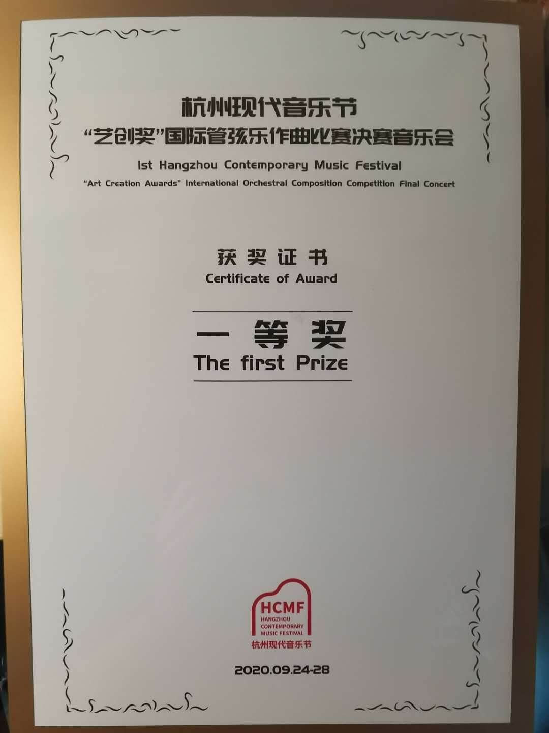 2020年9月,第一届杭州现代音乐节“艺创奖”国际管弦乐作曲比赛决赛音乐会在浙江杭州落下帷幕。本次比赛面向全球征集杰出的原创管弦乐作品,共征集有来自23个国家和地区的116部作品。经过评委会的初评,从中选出评选出了6部作品进入决赛以及4部作品获得优秀奖。